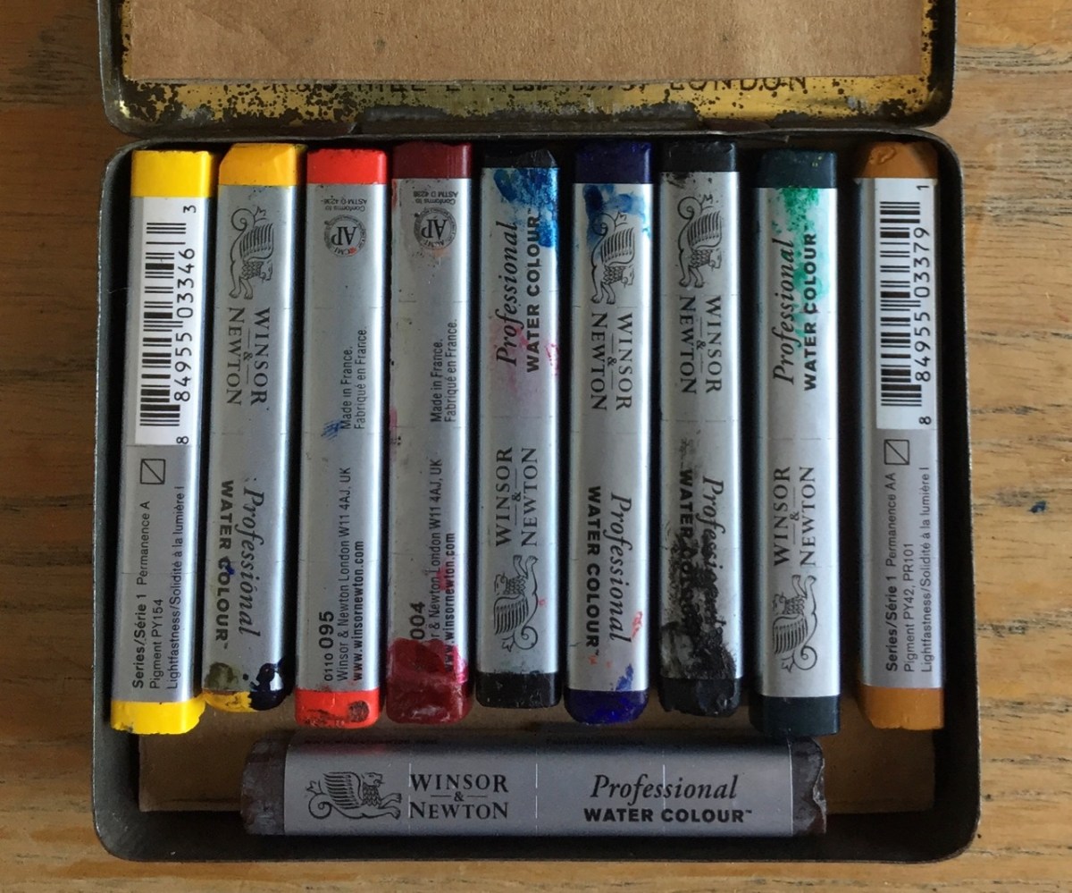 These are Winsor and Newton watercolour sticks. They are quite waxy, so once the colour is on, the ink won’t go on top of it, certainly not if the colour is thick.