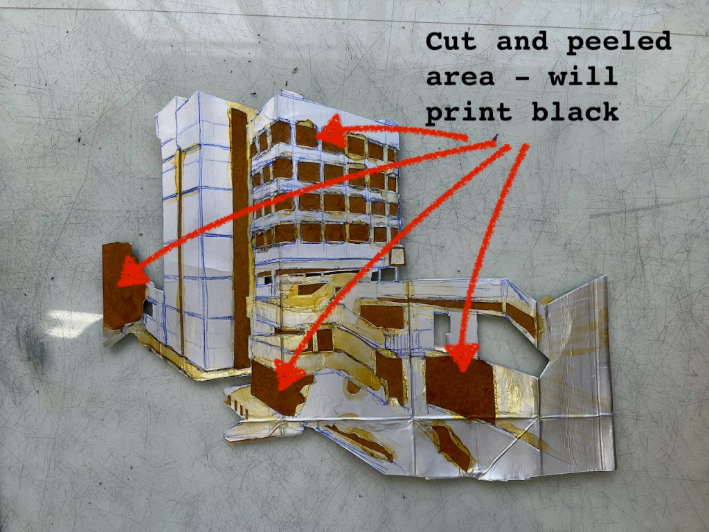 - With a scalpel carefully cut out and peel off the areas to be dark in the print