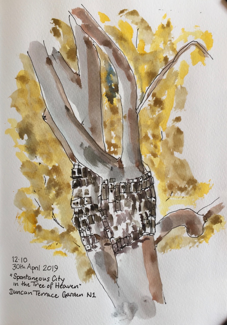 On the way to Kings Cross I passed through Duncan Terrace Gardens, in Islington, where there is an extraordinary “bird hotel” in one of the gigantic trees. It was made by “London Field Works” and consists of 300 specially made bird boxes, all different sizes, fitted round the tree.