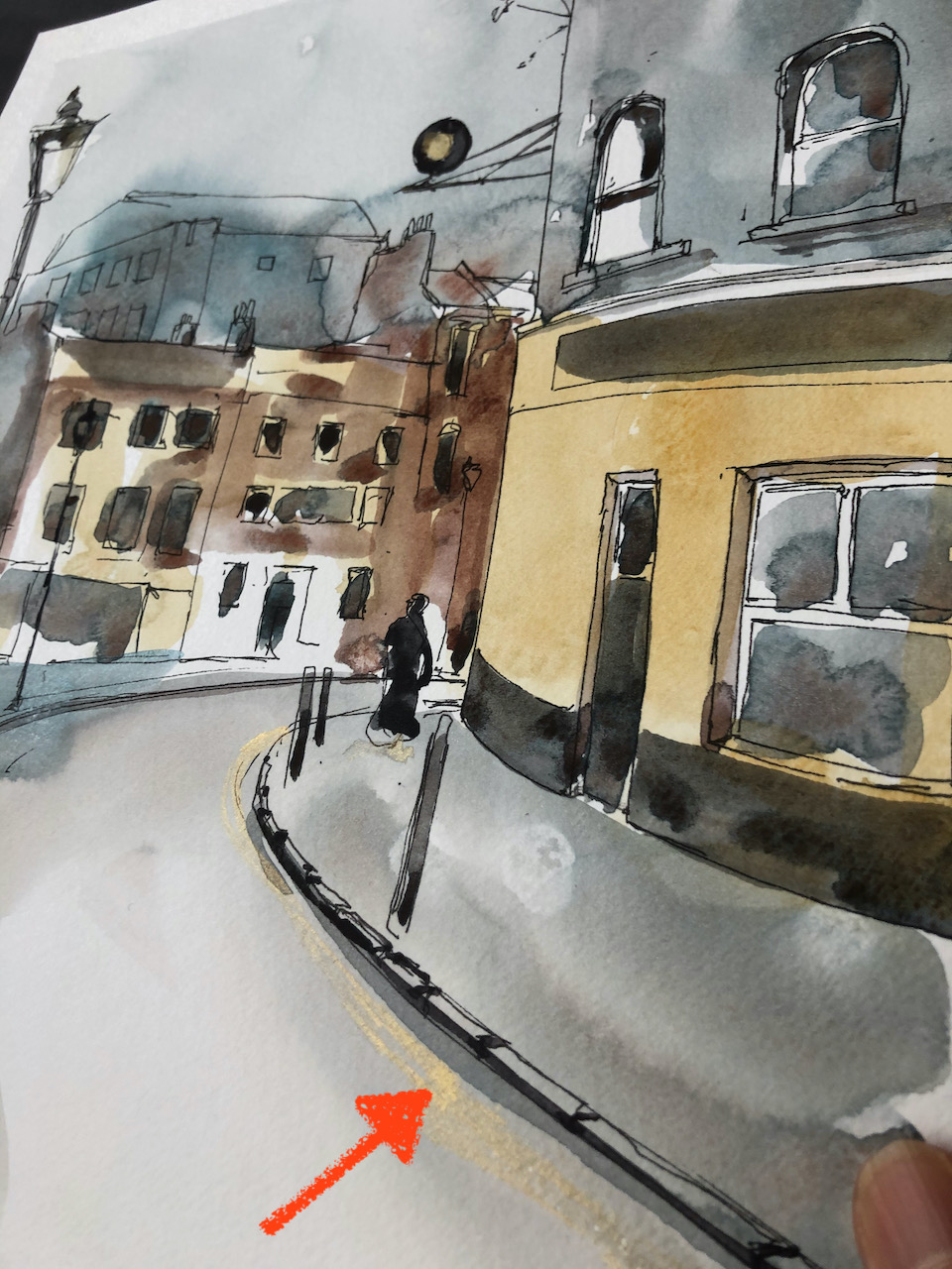 This drawing took about an hour. The colours are: for the walls – Fired Gold Ochre (DS), Mars Yellow (DS) and Phthalo Turquoise (W&N) , for the light in the windows Hansa Yellow Mid (DS). The drawing is 7″ x 10″, done in a sketchbook on 300gsm Arches Aquarelle Paper.