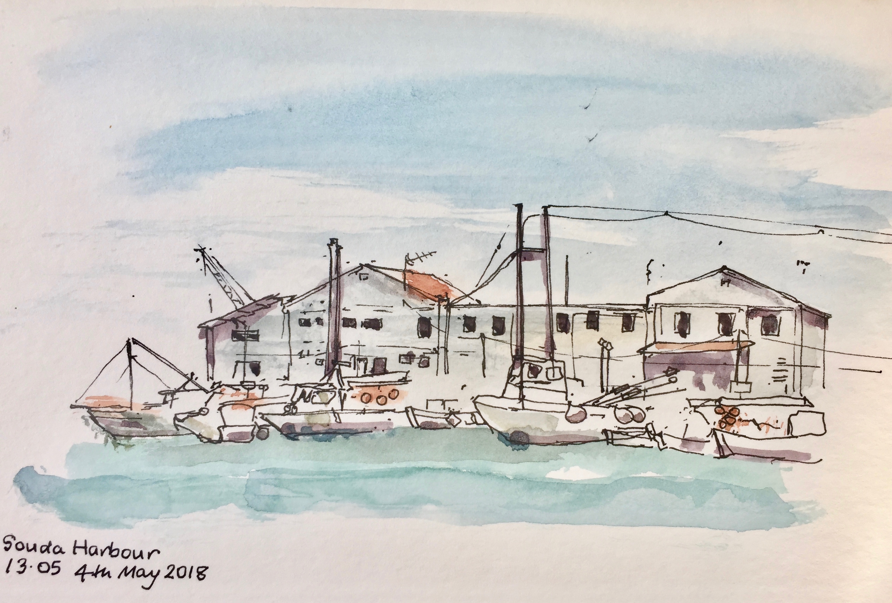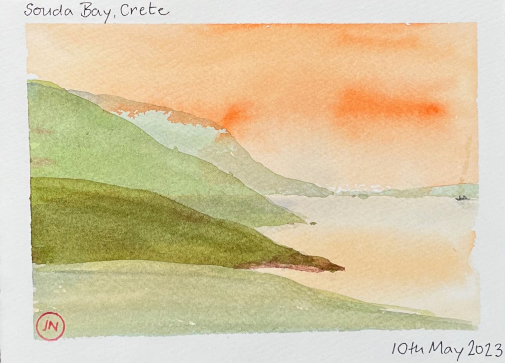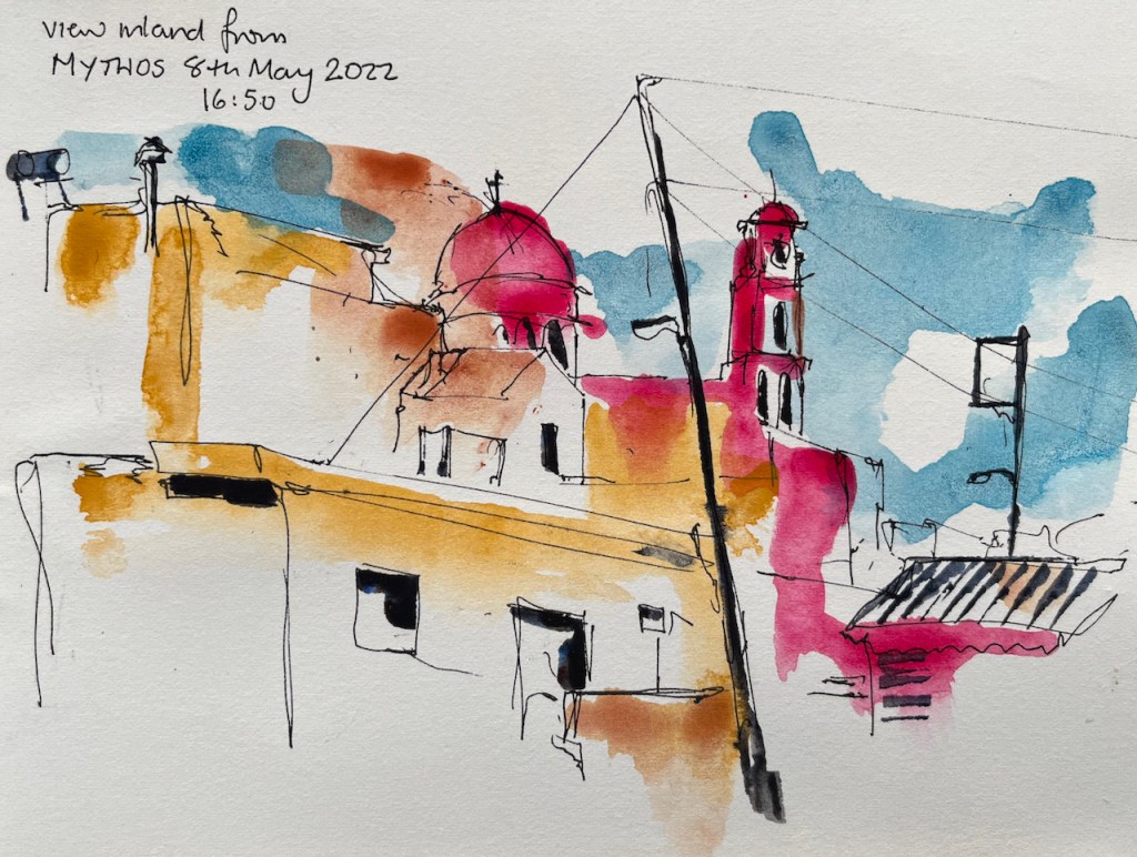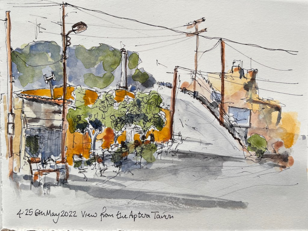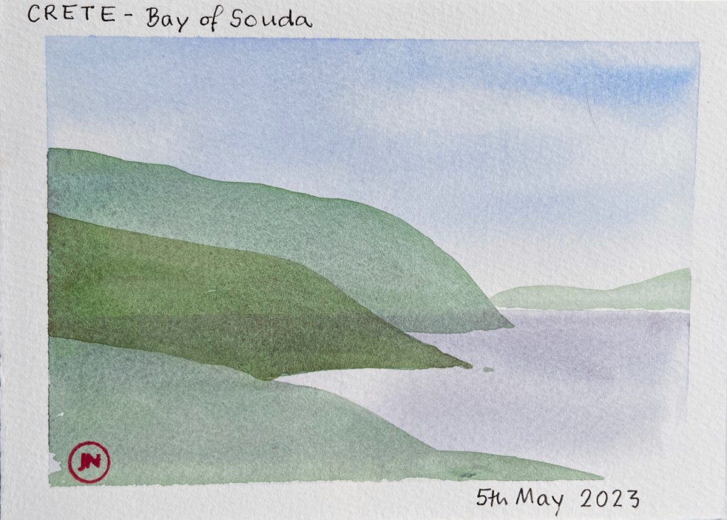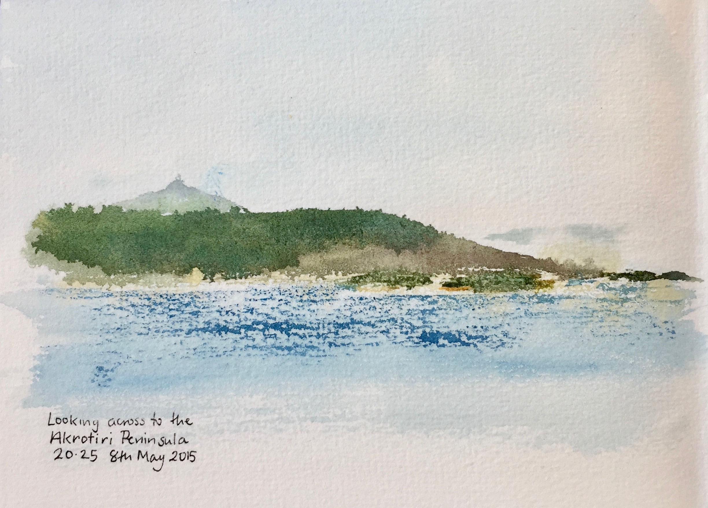 After that, I used pencil and watercolour only. Here is a view of the Akrotori peninsula. The warship is lurking in the NATO base.