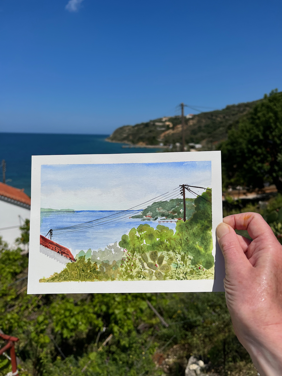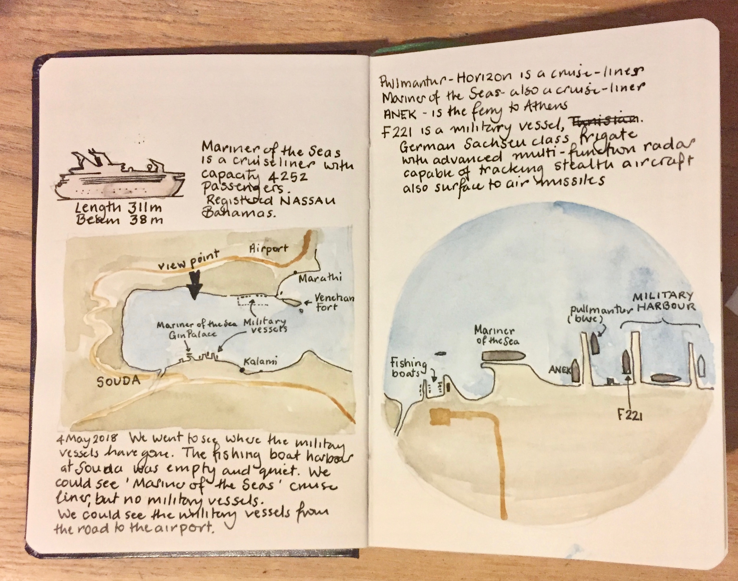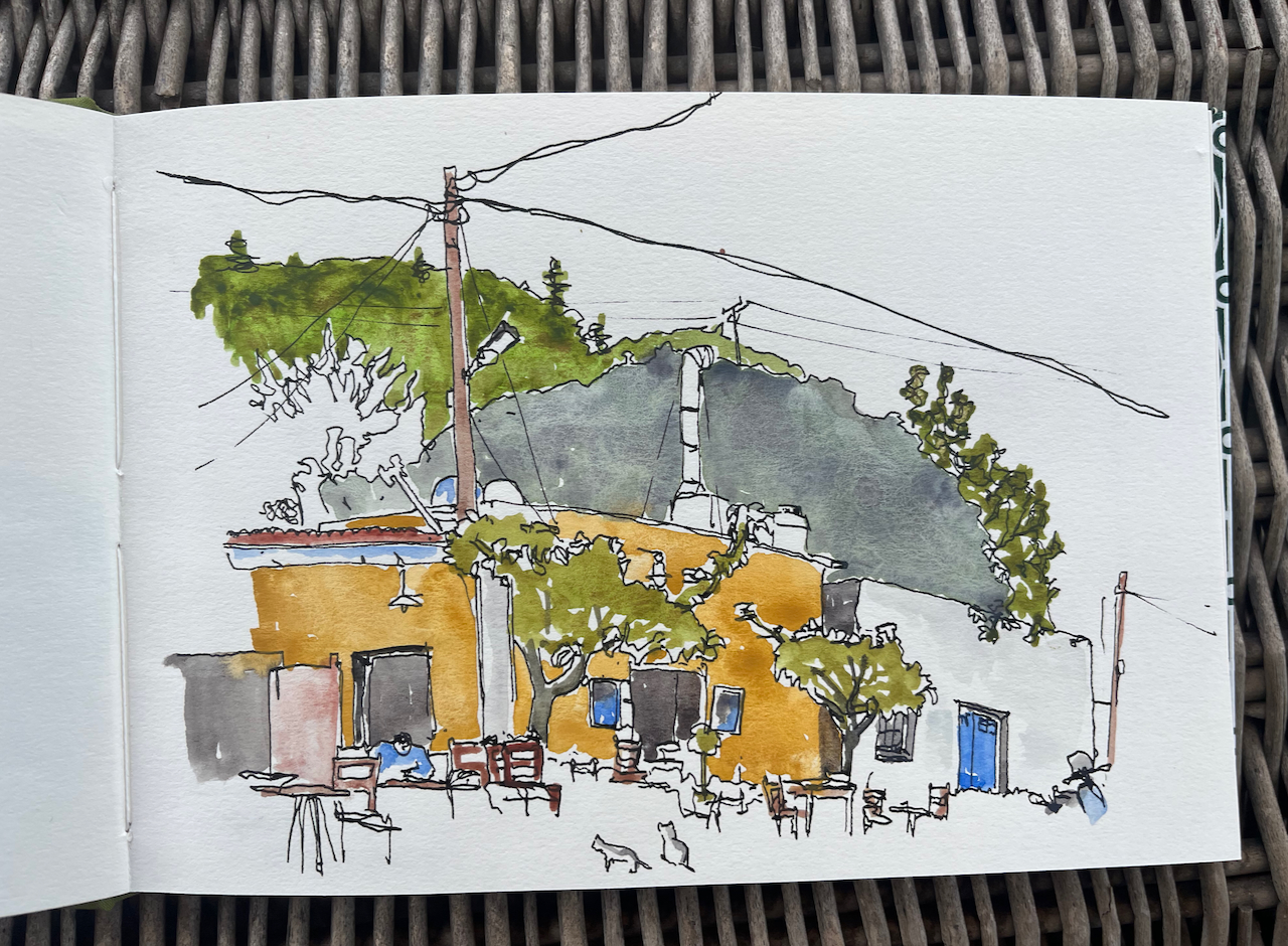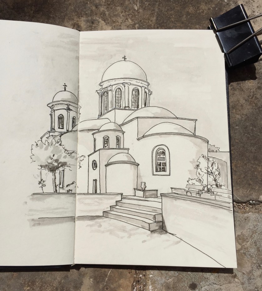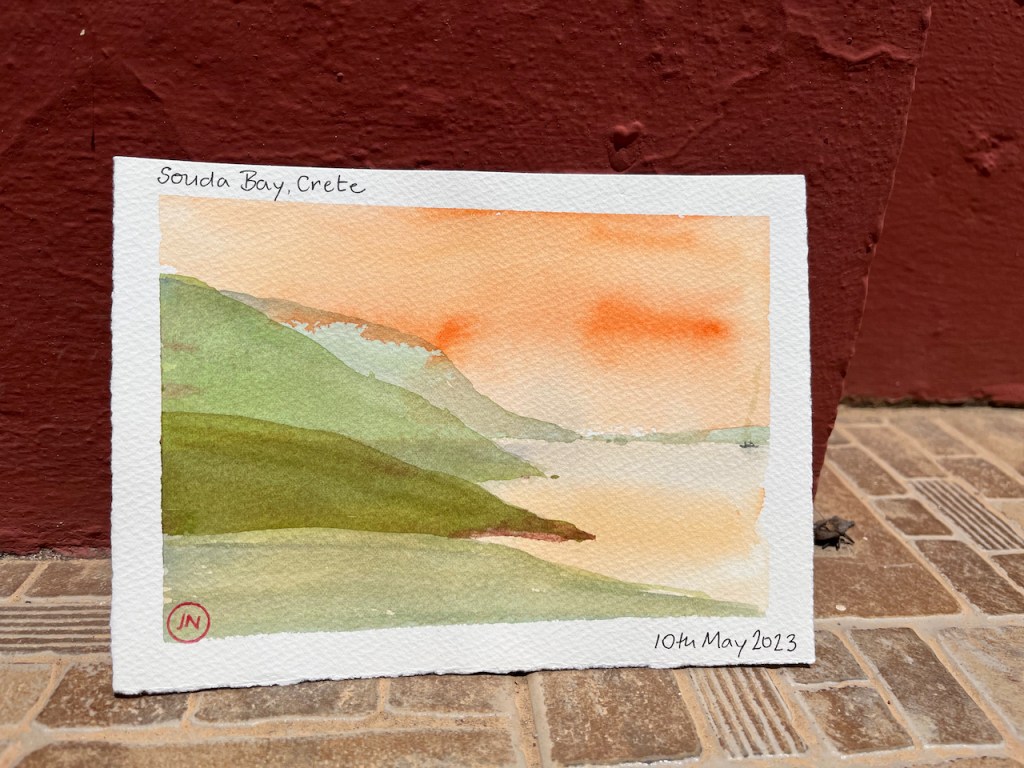After that, I used pencil and watercolour only. Here is a view of the Akrotori peninsula. The warship is lurking in the NATO base.