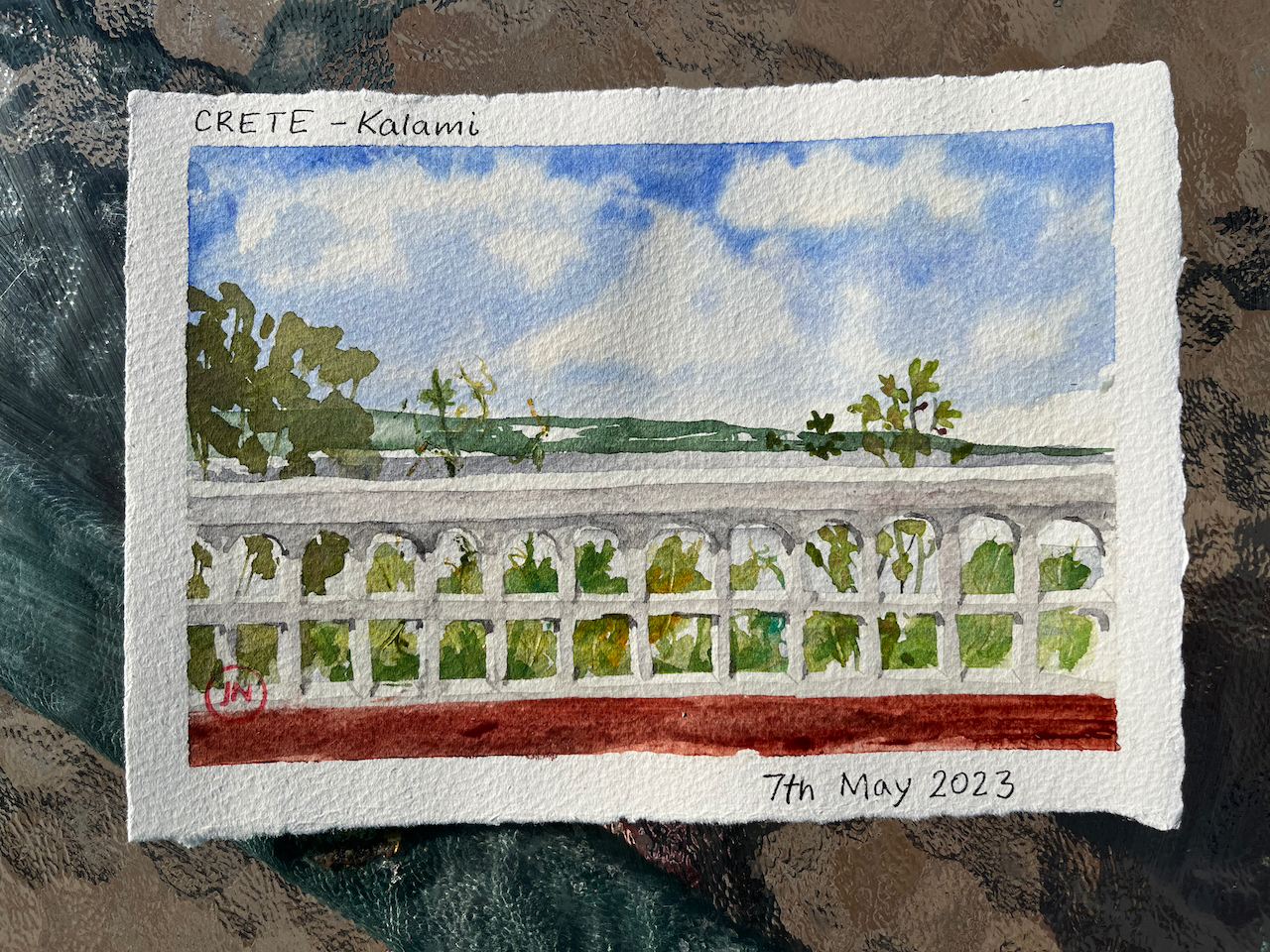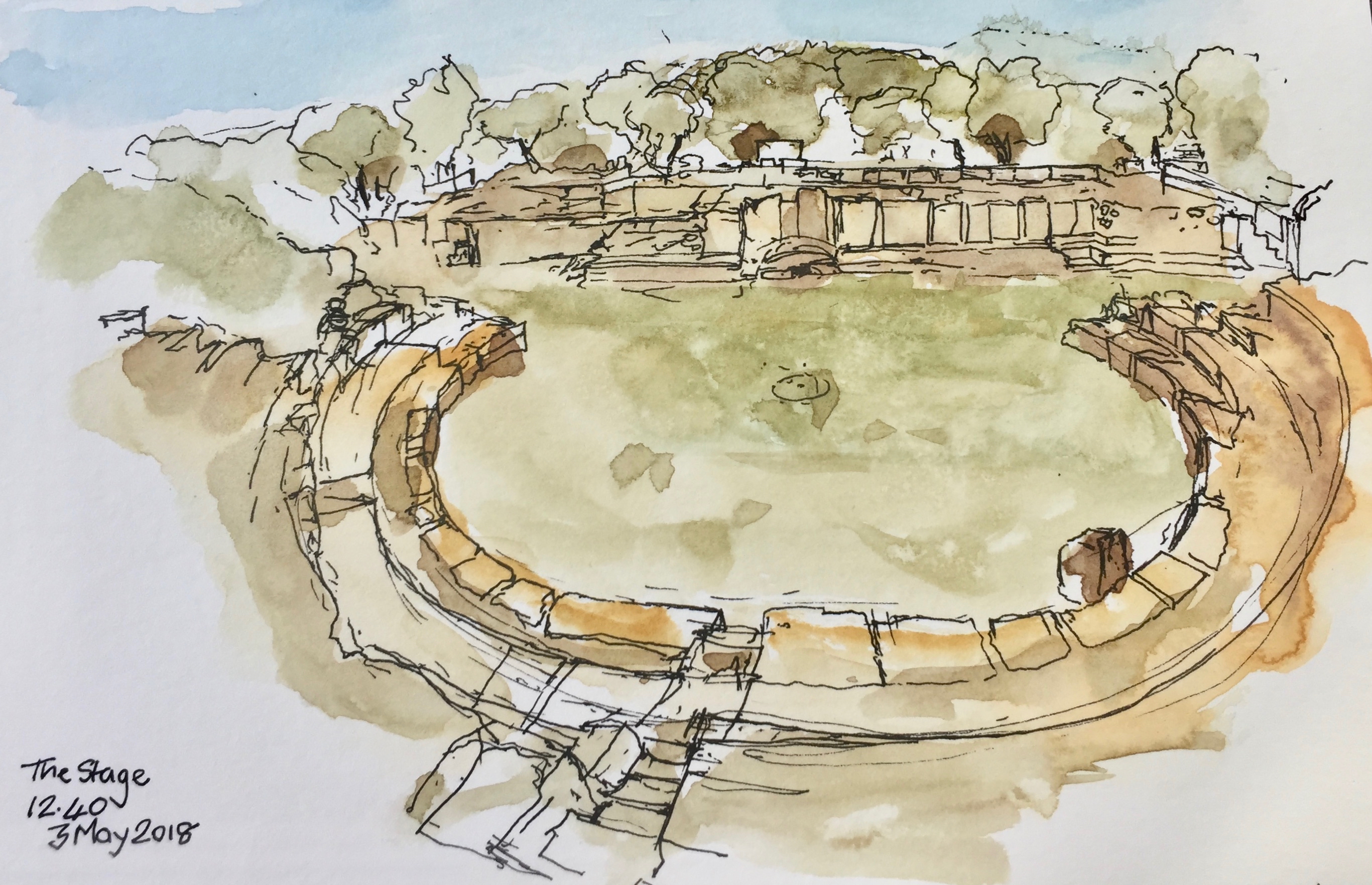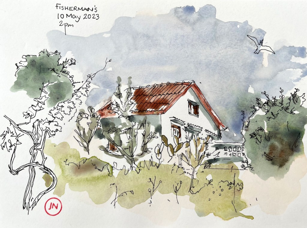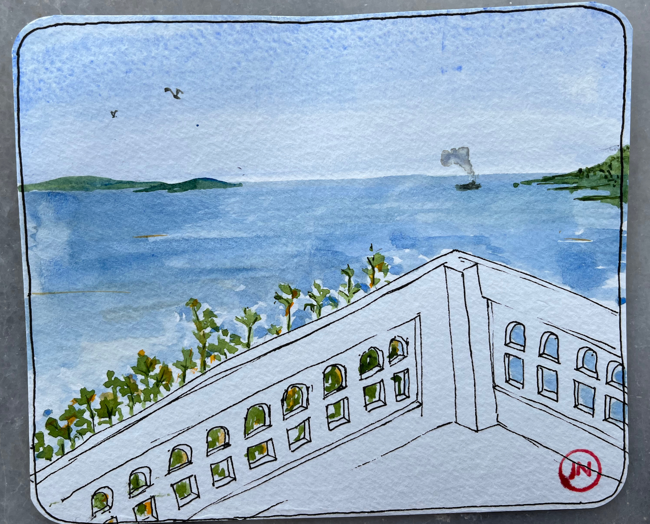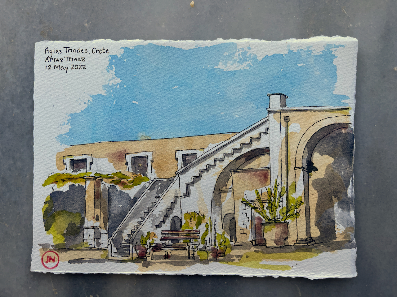 After that, I used pencil and watercolour only. Here is a view of the Akrotori peninsula. The warship is lurking in the NATO base.
