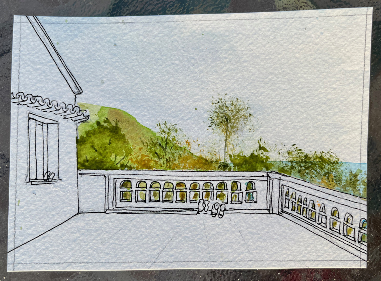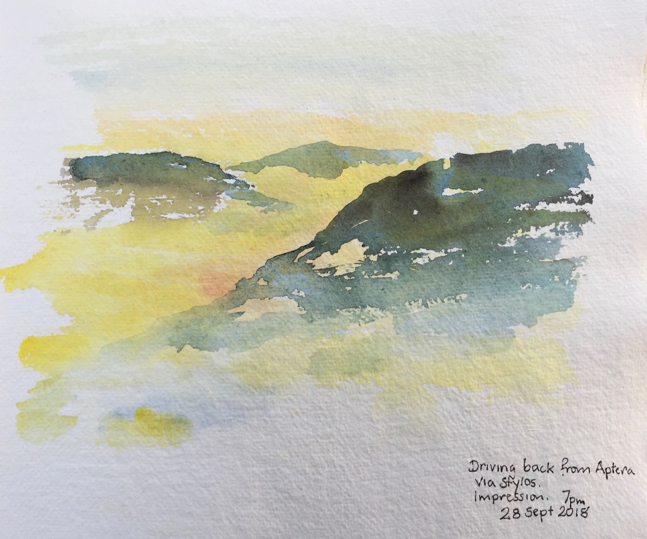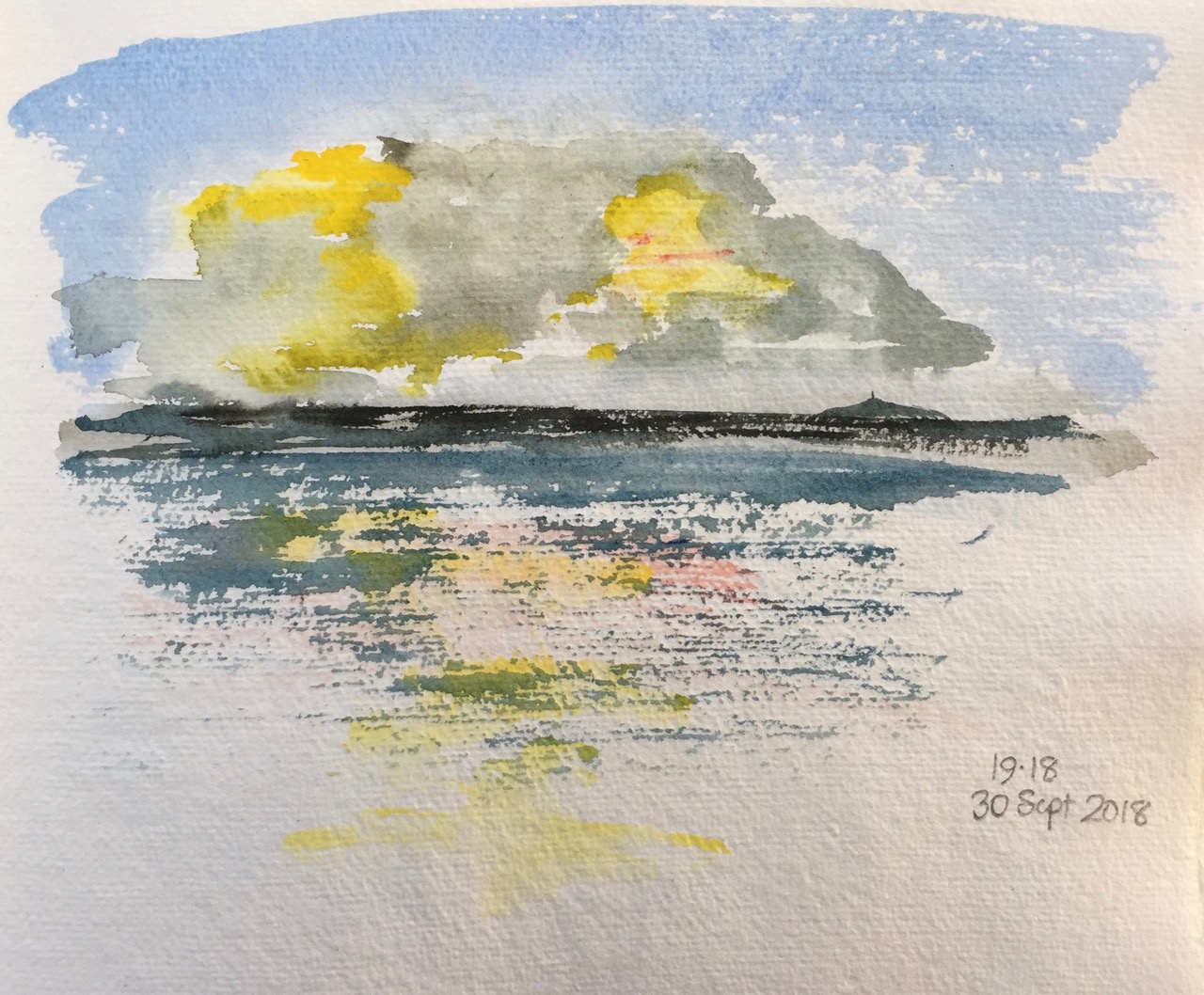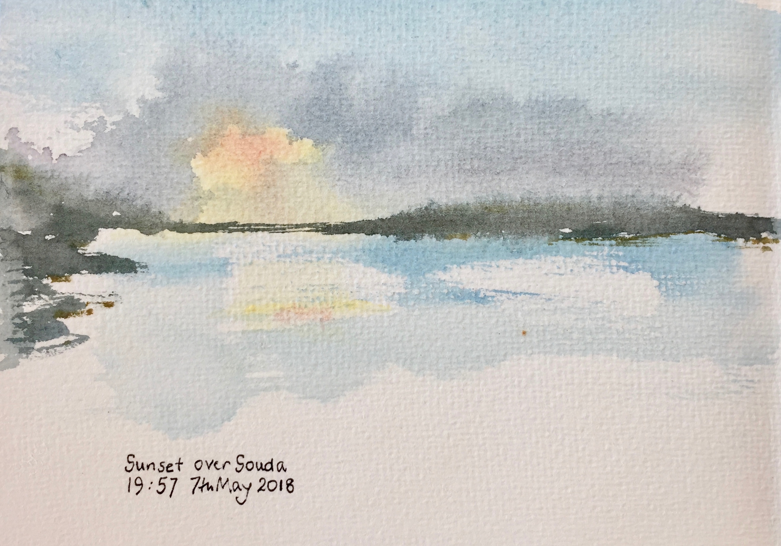 After that, I used pencil and watercolour only. Here is a view of the Akrotori peninsula. The warship is lurking in the NATO base.