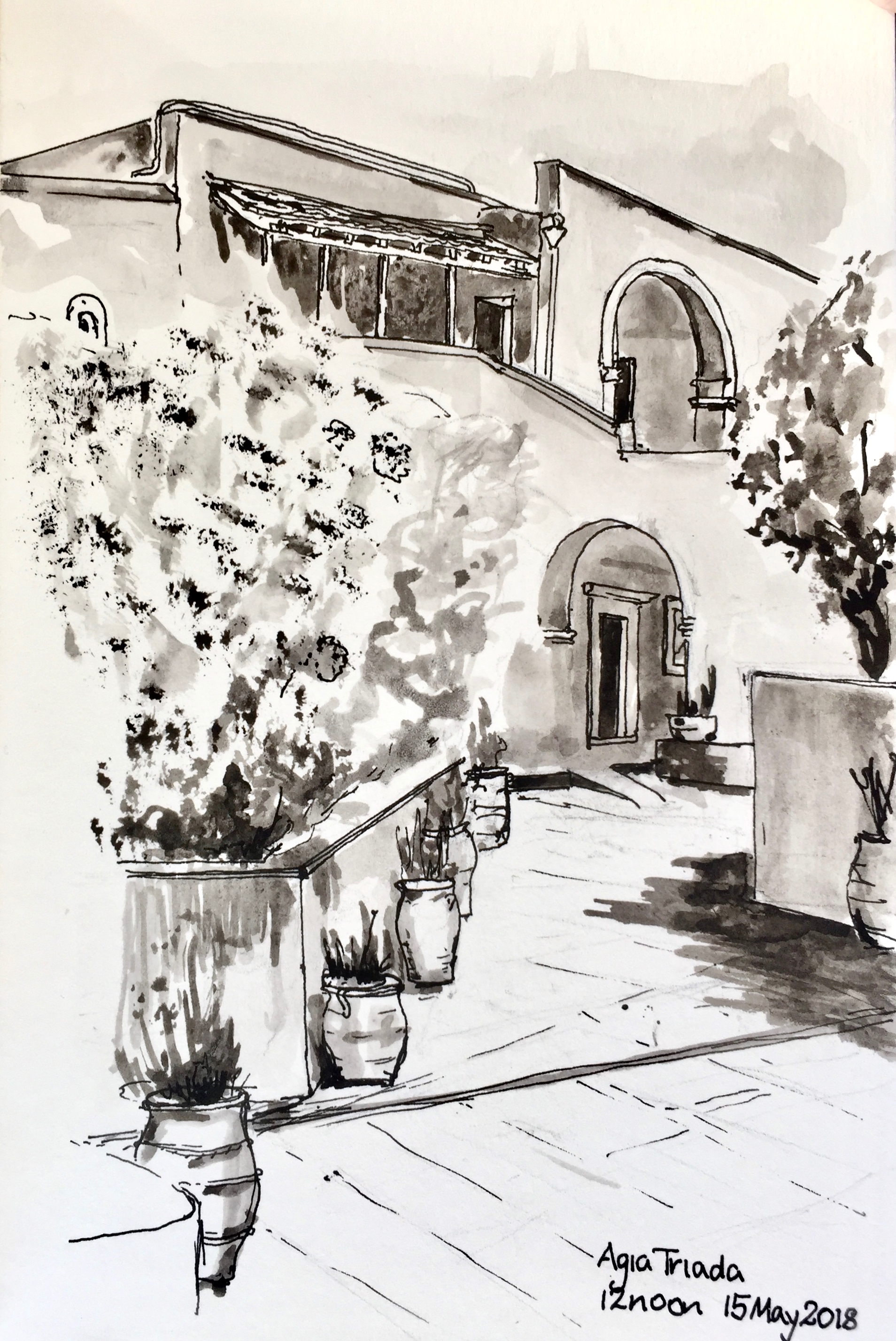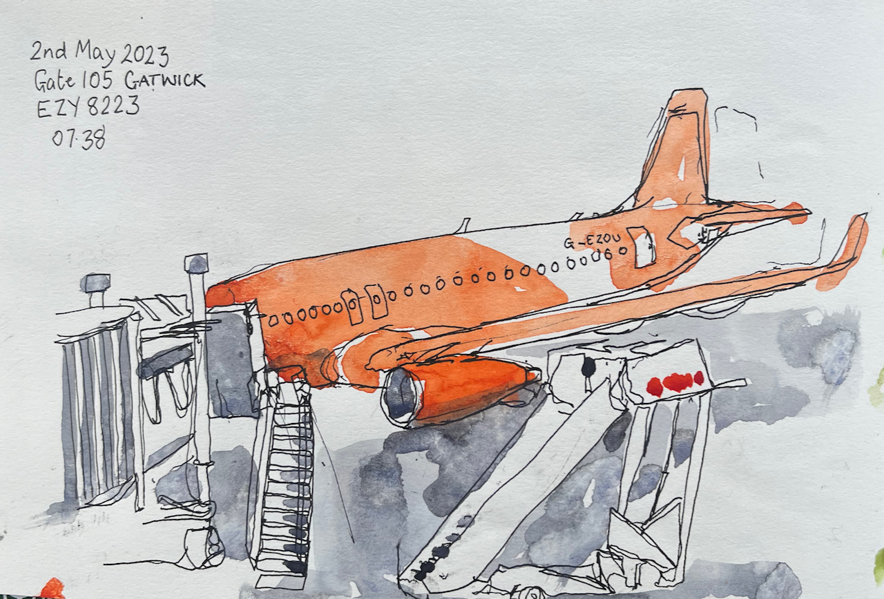 The air in Crete was warm and damp. This affected the paper. See how the ink has spread in this pen and ink sketch at the airport: