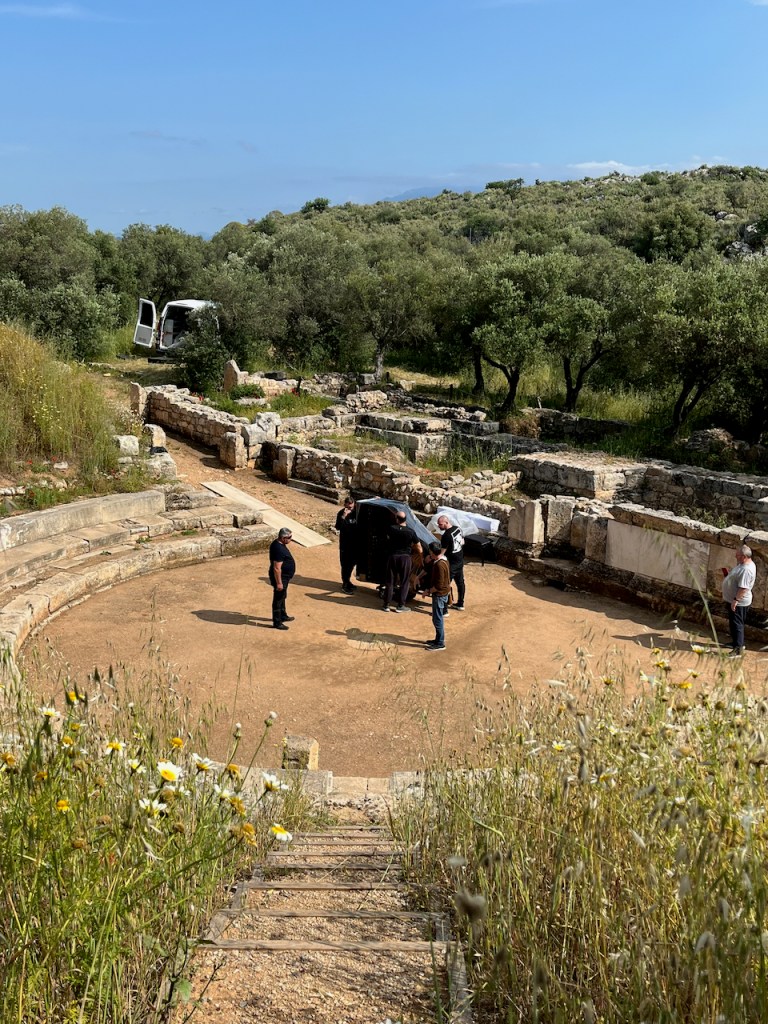The grass was cut around the lower buildings in ancient Aptera, revealing arches.