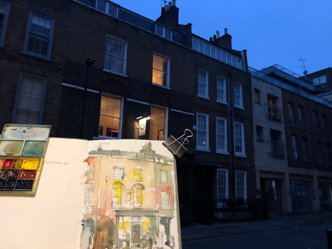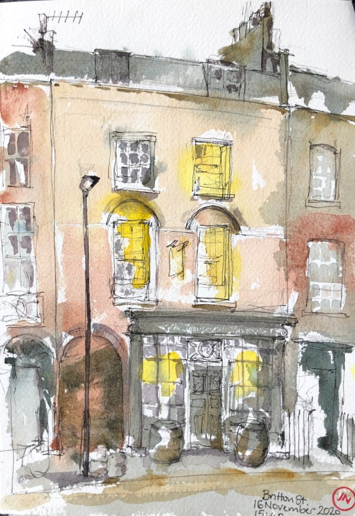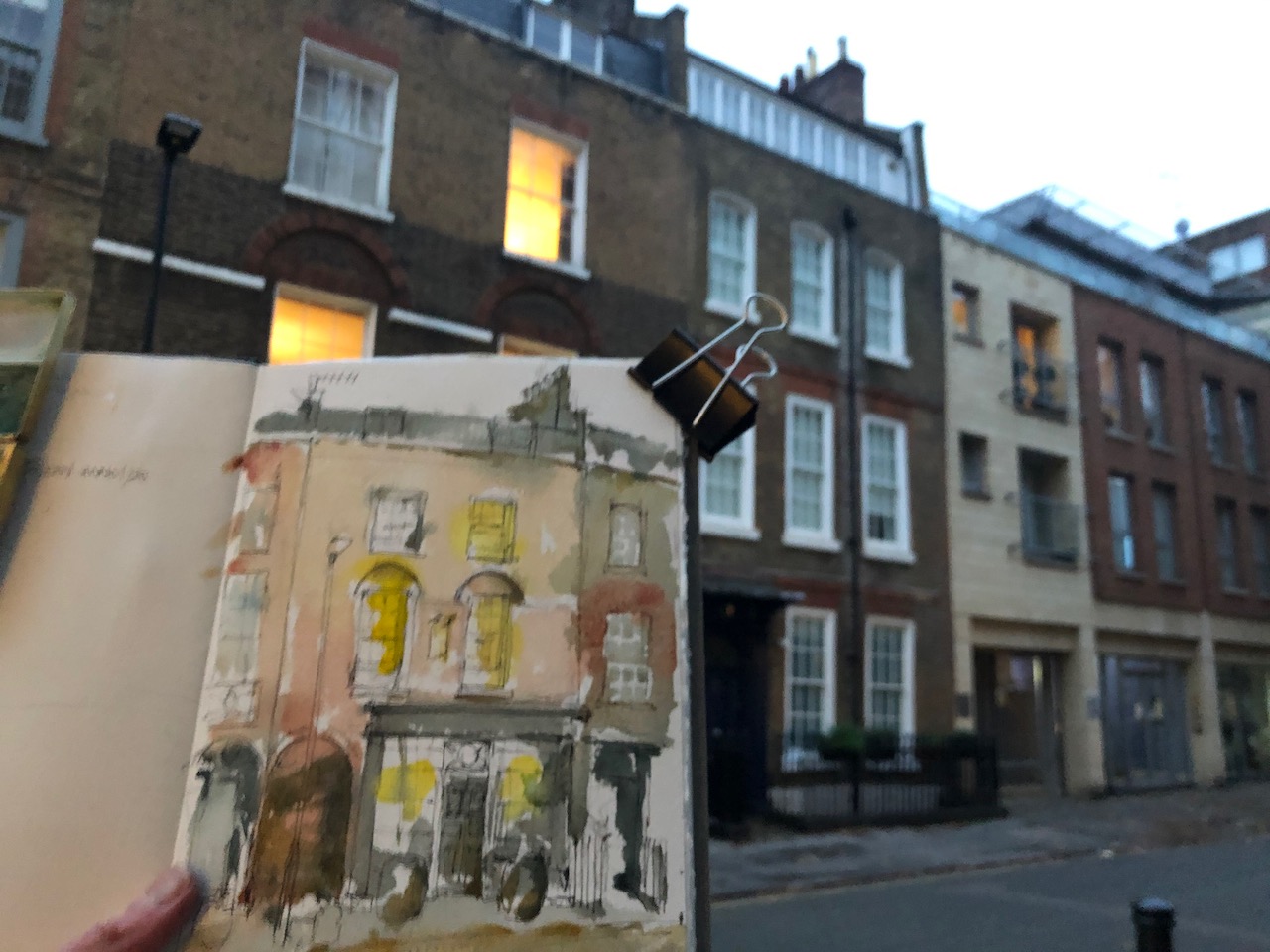 Here is a sketch of The Jerusalem Tavern, Britton St, Clerkenwell, made as the light faded. I find this a particularly lovely building. The curves over the windows are semicircles and there is a pleasing symmetry to the upper floors. The semicircle over St John’s Passage exactly matches the door to its left, on another…