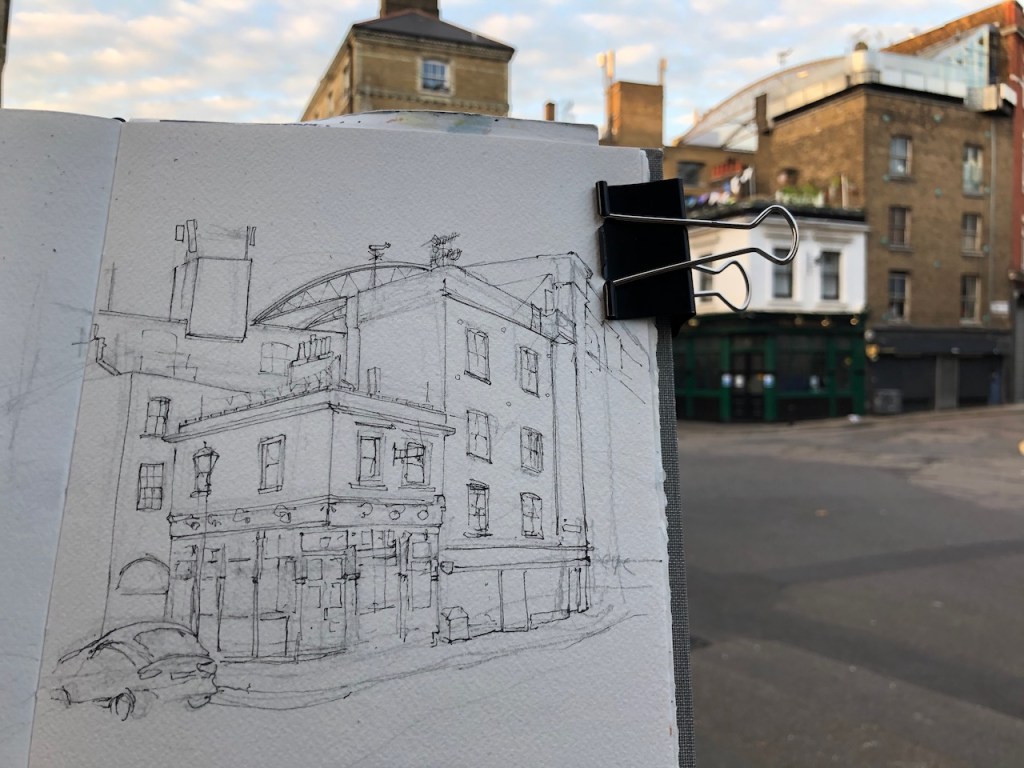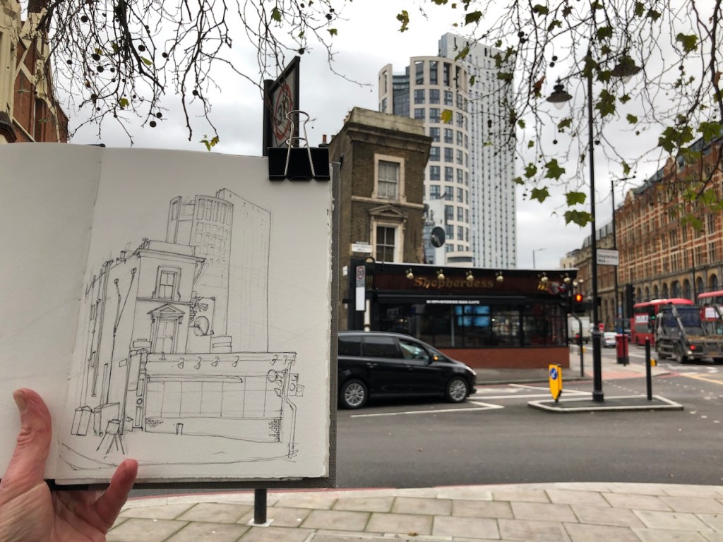 I sketched The Sekforde, sitting on a step on the other side of the road. The pub was closed today. It looked like a good pub. While I was sketching I received confirmation of this. Two portly men strolled past, paused, and asked me if I was waiting for the pub to open. I said…
