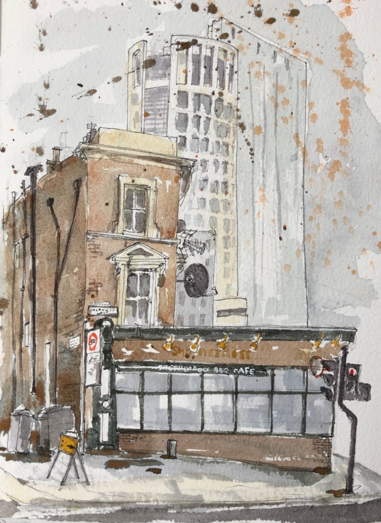 Just off the picture to the left is the Eagle pub. Both the Eagle pub and the narrow building I’ve drawn are remarkably dilapidated, given their location in a trendy part of town, right near Old Street Roundabout. I feel their existences are somewhat precarious. See the huge shiny towers, only a few hundred metres away.