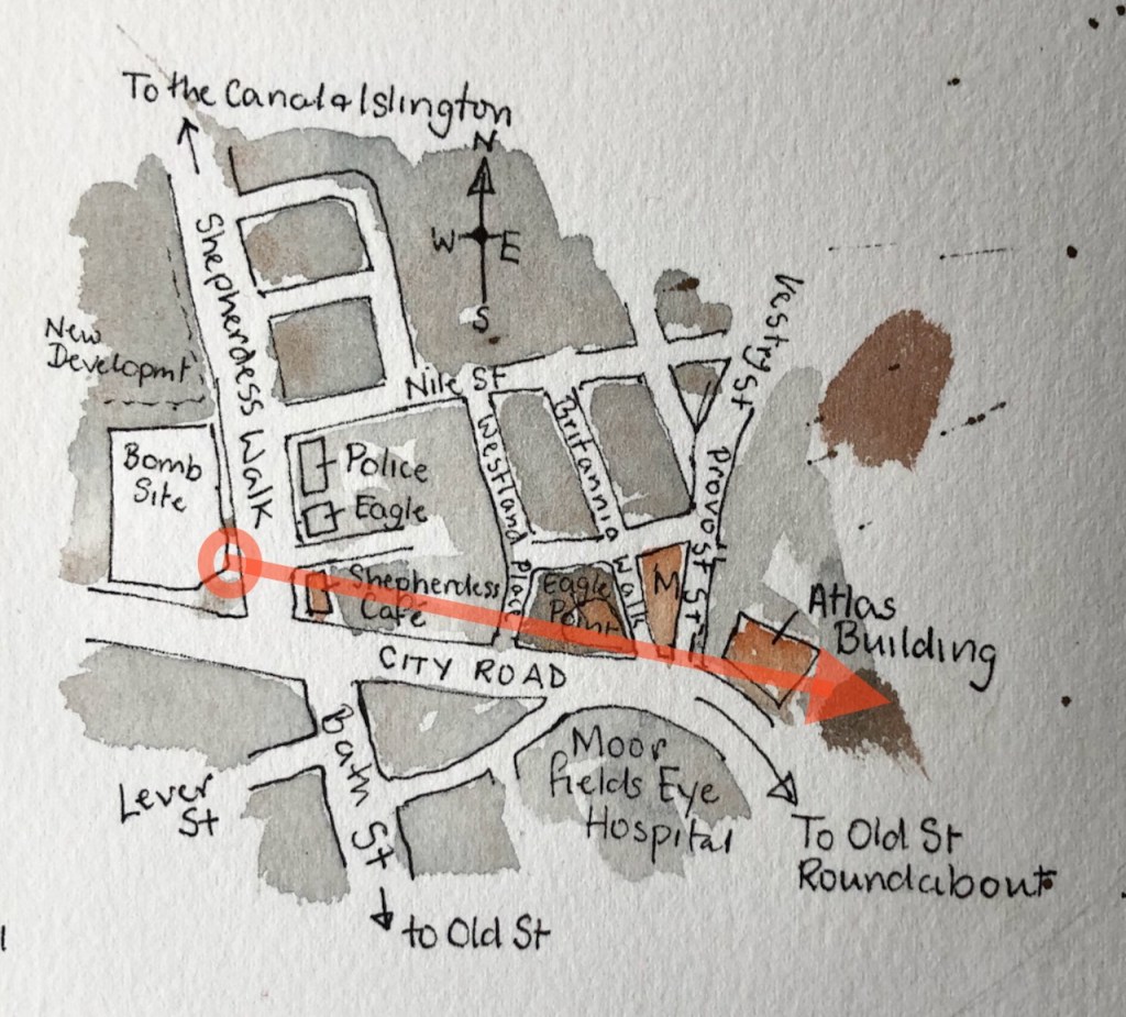 There is a police station next to the Eagle pub, offices and housing all around. Moorfields Eye Hospital is just across the City Road. It’s a busy corner. The Shepherdess Café was closed because of lockdown.
