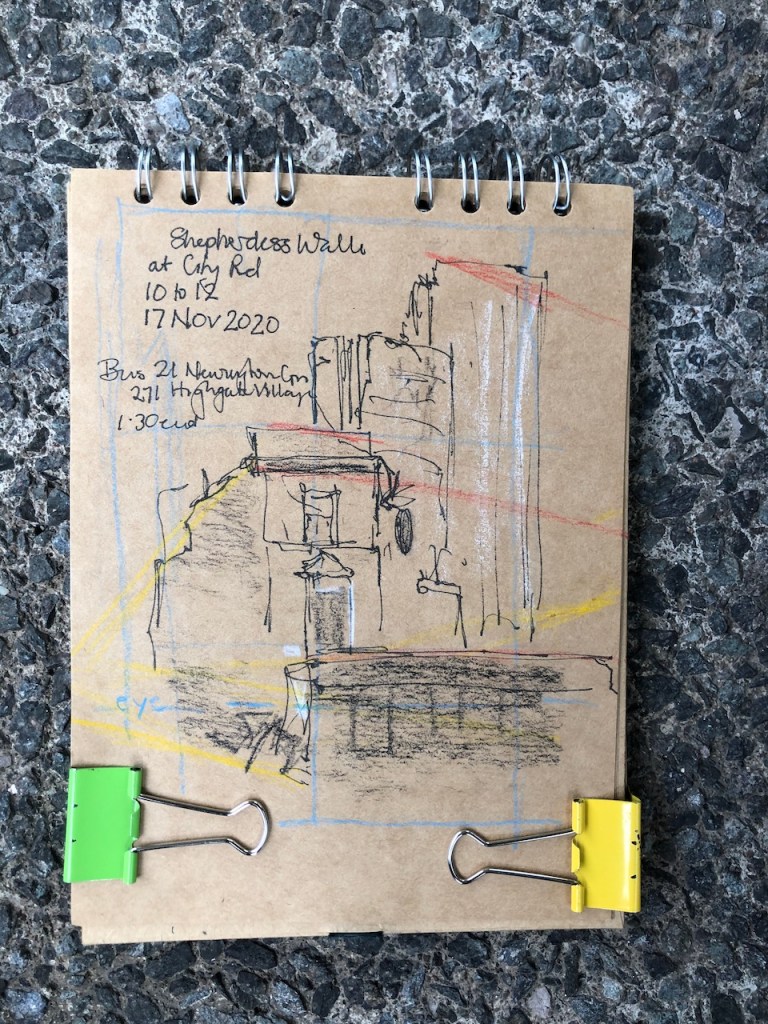 Five different buses pass the spot where I was drawing. They all head North up Shepherdess Walk: