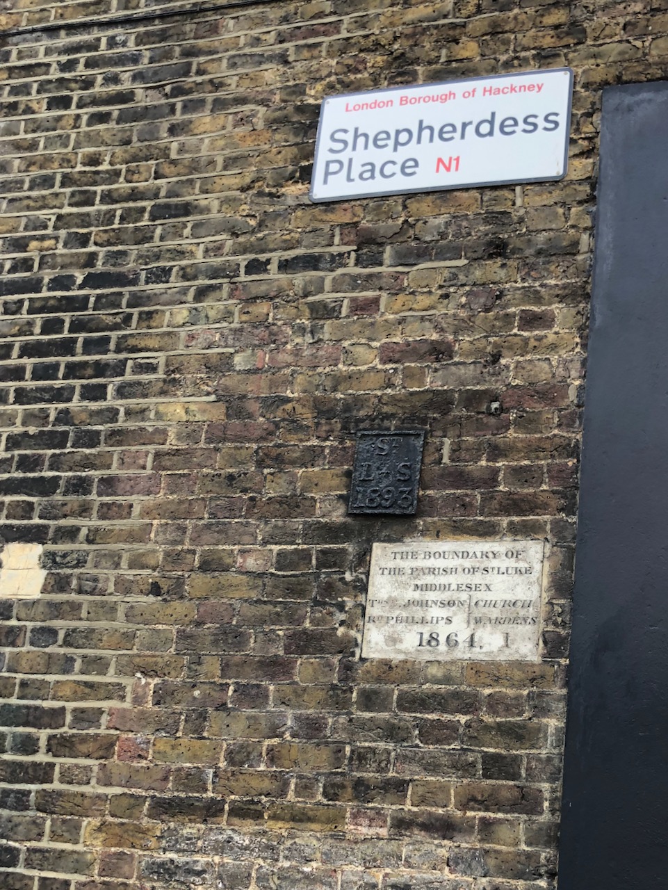The white stone in the brickwork tells us that this small street marks a parish boundary. It says “The Boundary of the Parish of St Luke Middlesex, Ths B Johnson, Rd Phillips, Church Wardens, 1864“, with an additional figure “1” whose meaning is obscure to me. Can we assume “Ths” is “Thomas” and “Rd” is Rudyard? The black notice confirms this boundary “St L-S 1893“, 29 years later.