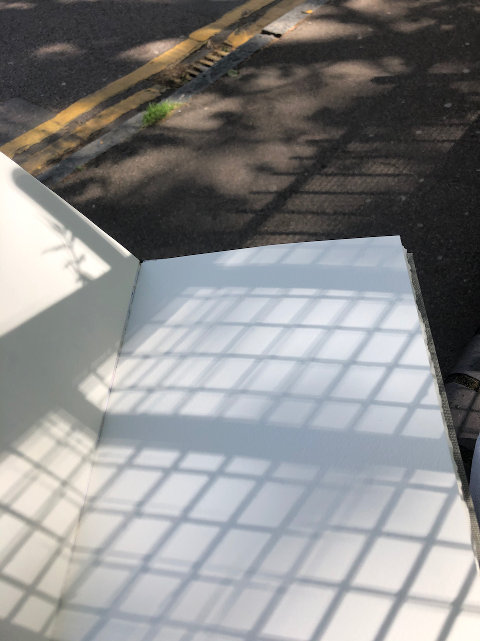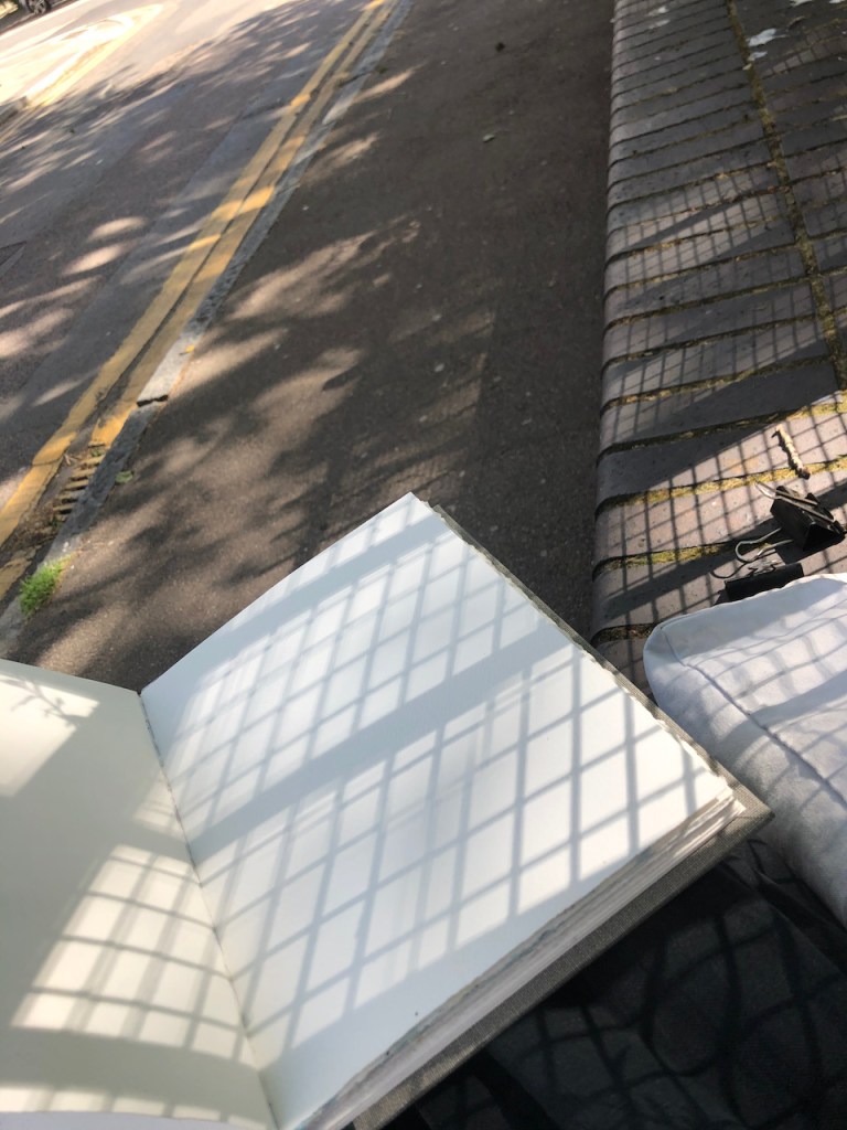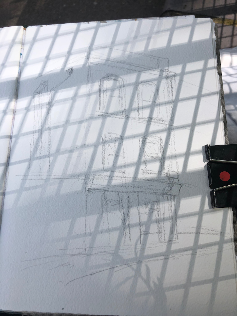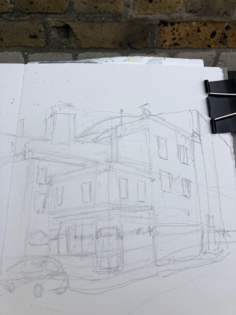 It was a lovely sunny day. I enjoyed the shadows on the house. When I sat down on the wall and got myself organised to sketch I found I had some startling shadows on my page.
