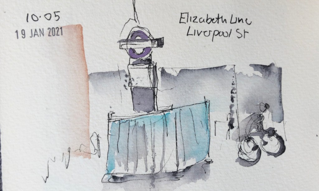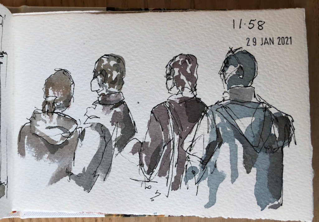 There was a blue sky as I drew. But do not be deceived: it was cold, as you see from the person on the right, hunched under their coat.