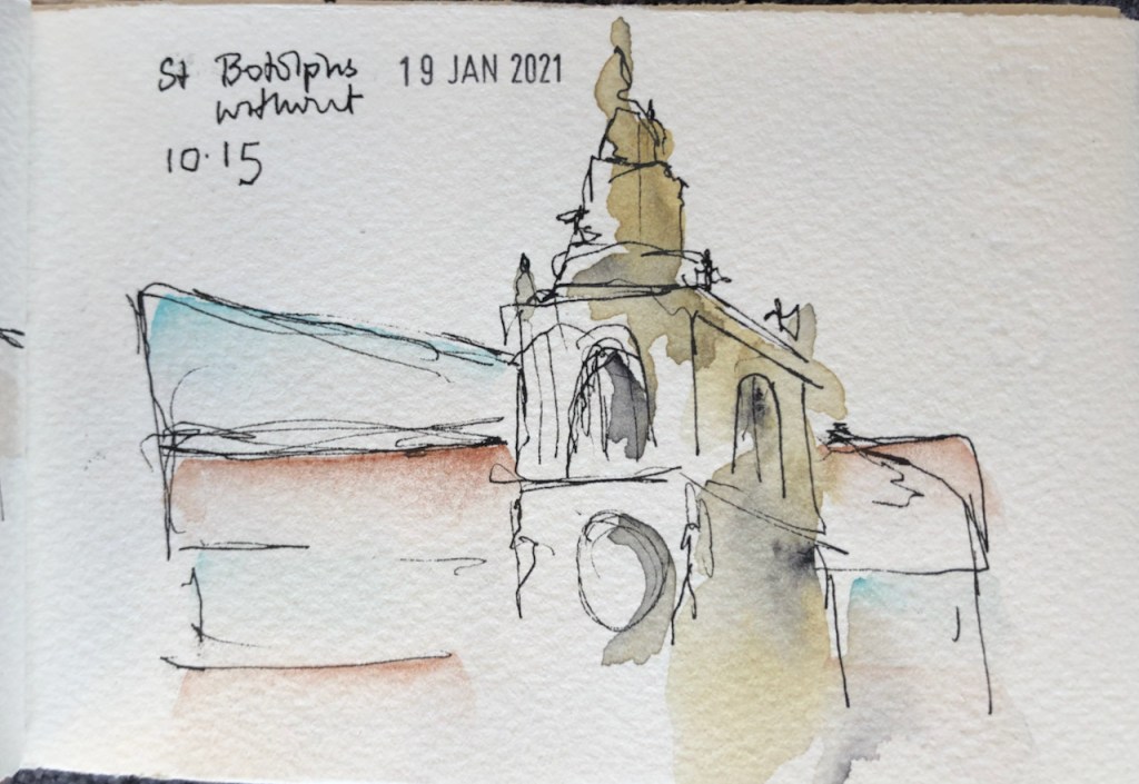 Here are some tiny sketches I made as a result of local walks. I have a small sketchbook, about 3½ inches by 5½ inches, the size of a big mobile phone. On my walks, I pause for a minute or so to notice a view, a detail. I make a few marks in the sketchbook, to remind me. Then when I get home, I make the sketch in watercolour, using the marks, and memory. I am trying to train my memory.
