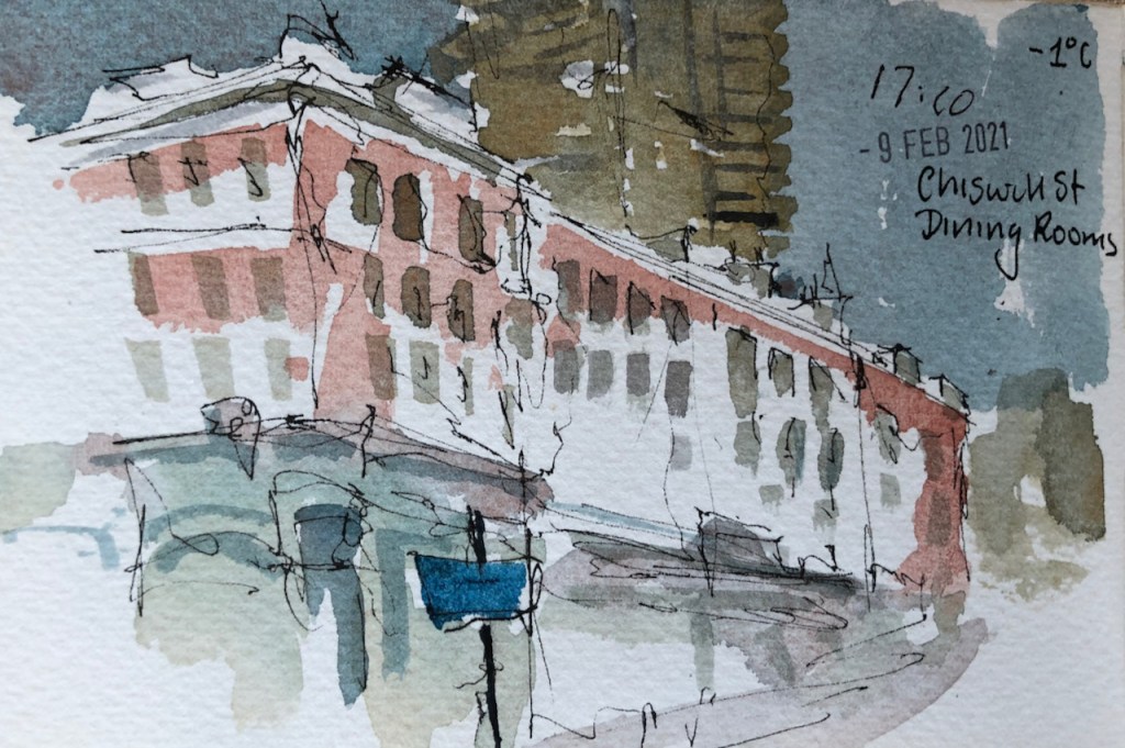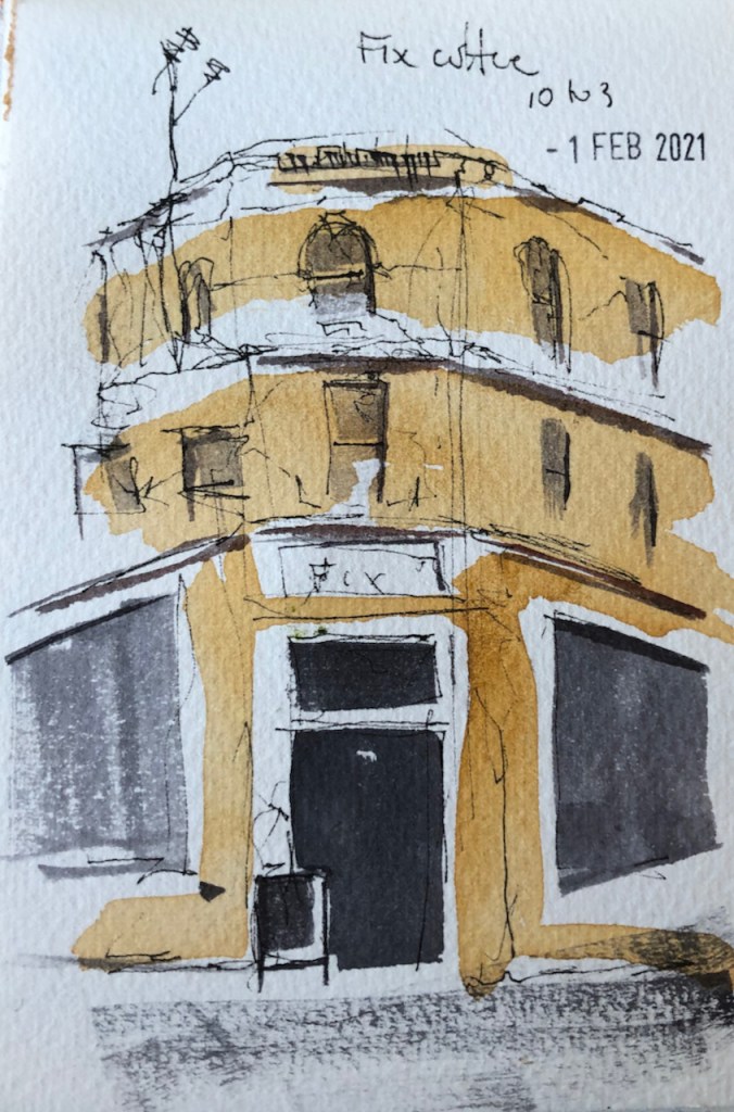 The friendly proprietor of the café admired my picture and pointed out that I could see the building, if I took a certain table by the window. “Then you can do the colour”, she said. I could. She brought a cup of water, a porcelain saucer, and a large amount of paper towel. This is a lady who knows what watercolour painters need. A mug of tea arrived as well. Comfortable and warm, I continued my sketch.