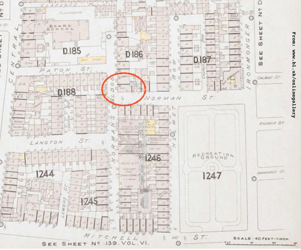 1901 map. Langton Arms circled. Insurance Plan of London North District Vol. D: sheet 17 (British Library) Shelf mark: Maps 145.b.23.(.d)