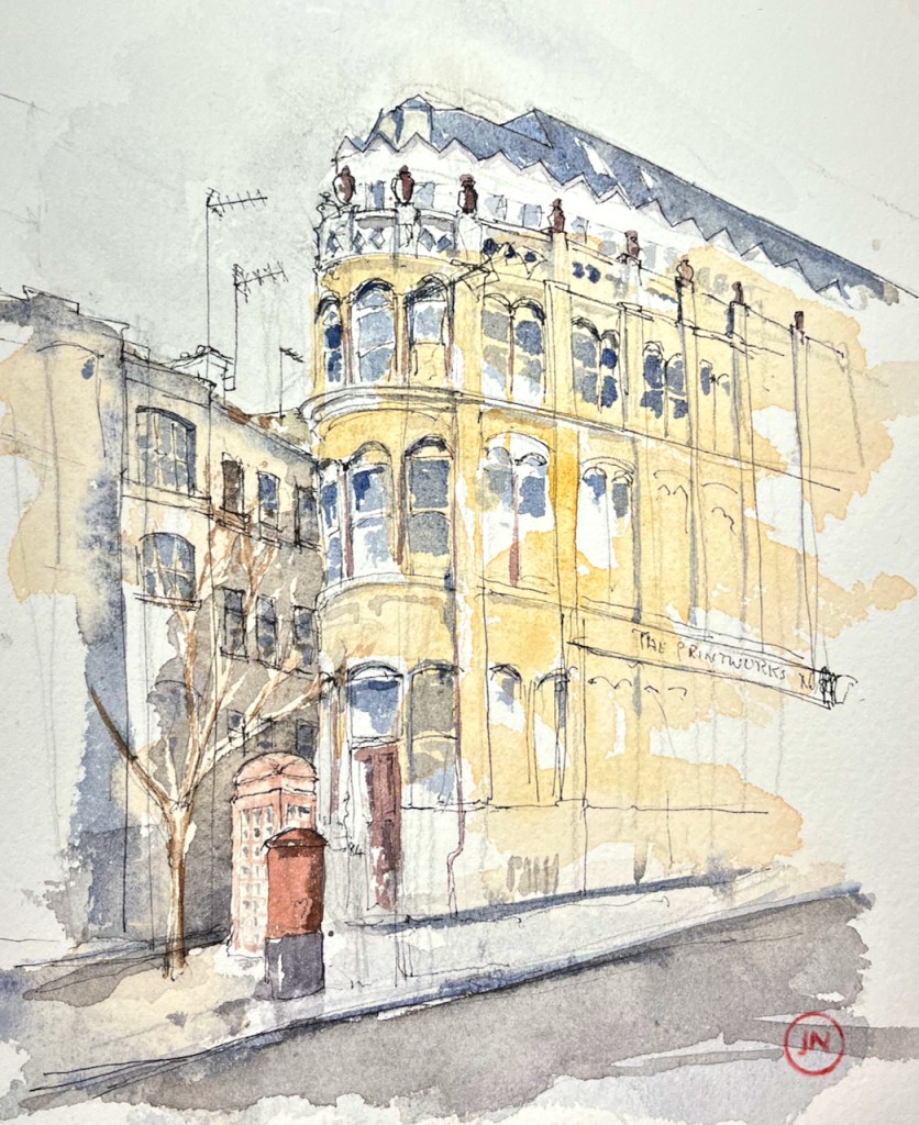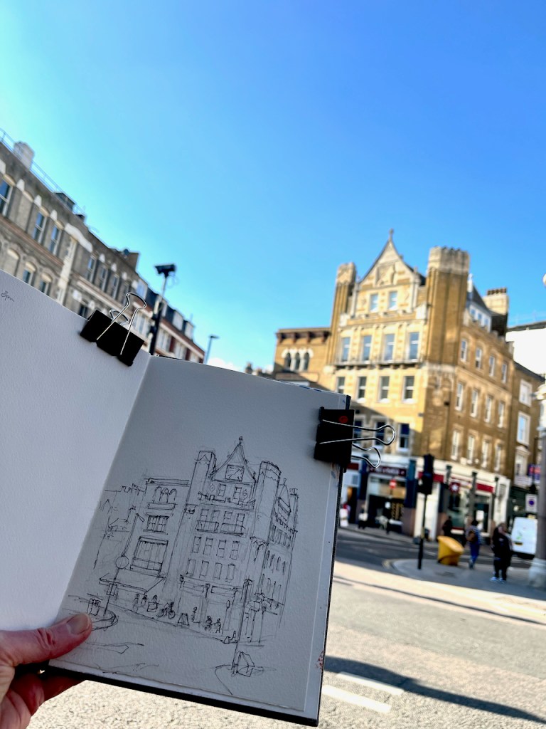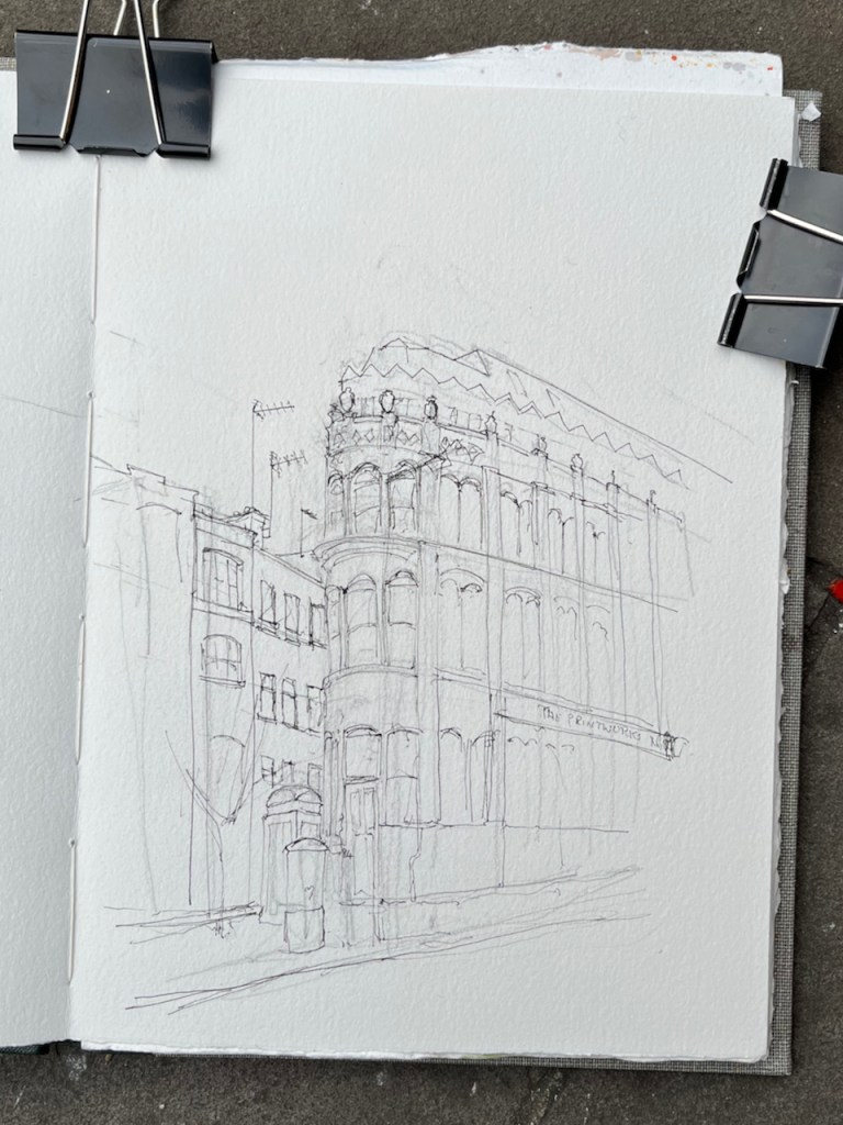 The pub itself has a roof garden, with brightly coloured bunting and many flowerpots. I drew this picture yesterday, during Lockdown 2, so sadly it is closed. However it is going on my “After Lockdown” list.