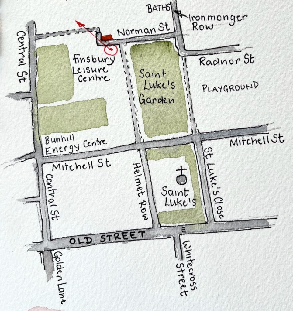 I sketched the closed-down pub at around 4:30pm, as the light faded. The pub sign is still there, but eaten away at the lower edge now. The street sign “Norman Street” is the same one as shown in a photo from 1958. It has “Borough of Finsbury” written above the street name. The Borough of Finsbury was absorbed into Islington in 1965.