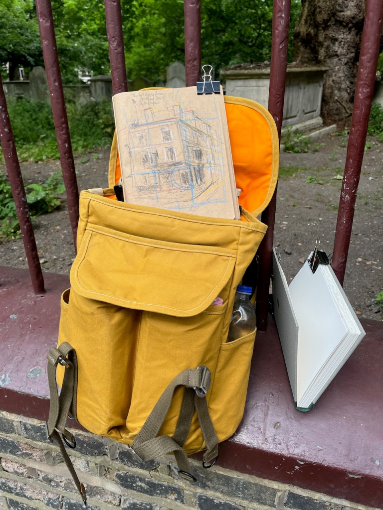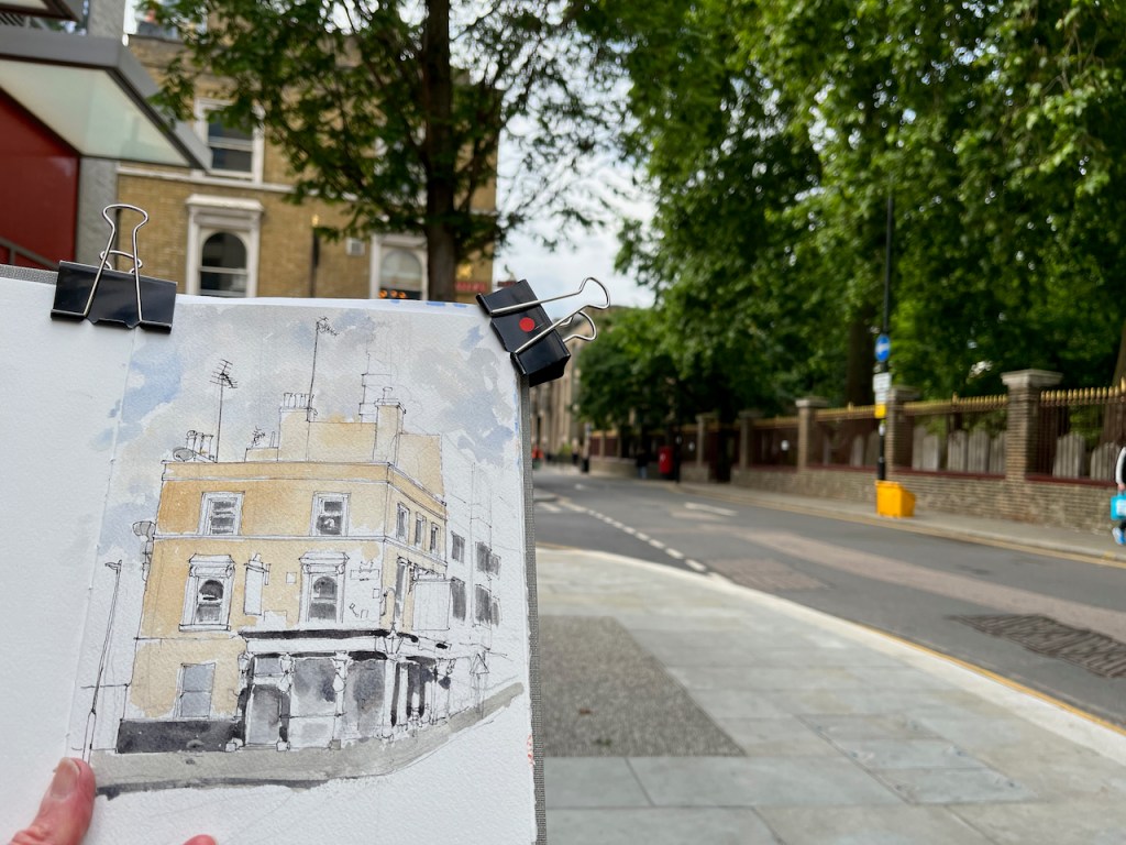 Here is a map and a photo of the ink drawing. I was sketching on a somewhat damp day, ‘rain with sunny intervals’. I went home at this point to finish the colours at my desk.