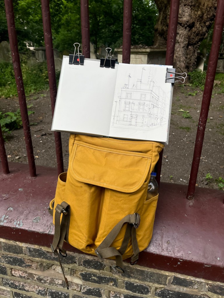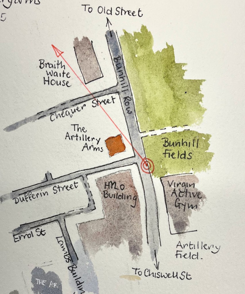 I sketched this standing outside the fence which surrounds Bunhill fields.