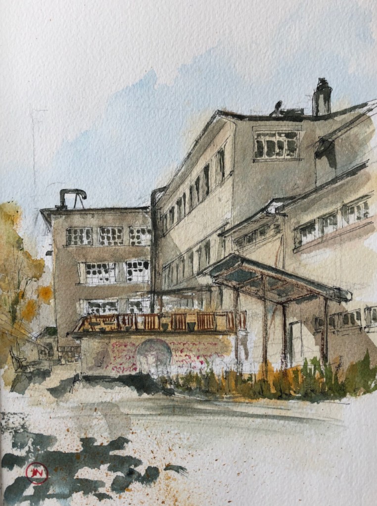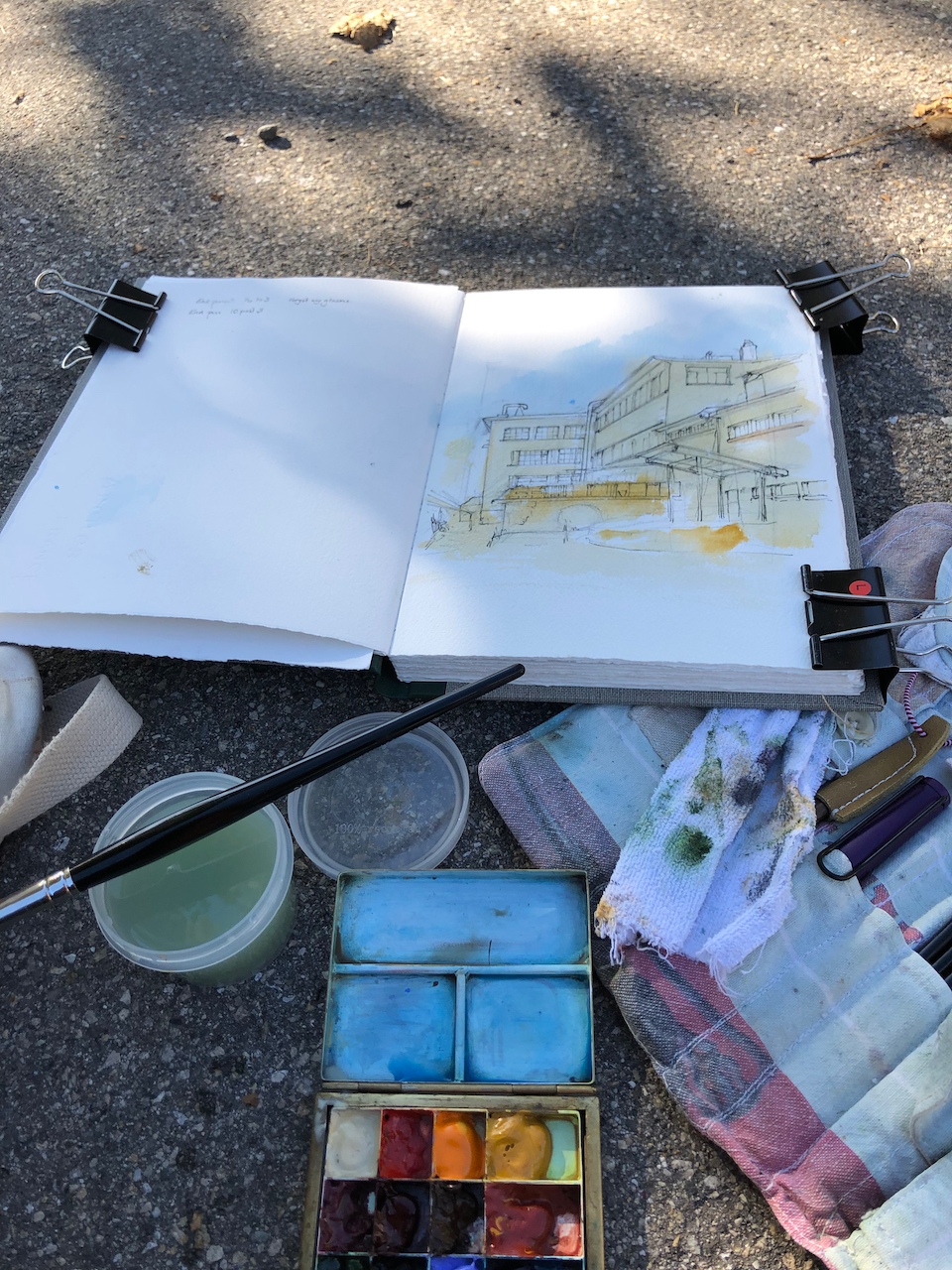 It was hot weather. Outdoors the paint dried quickly. Here’s the hotel from the other side of the road, drawn very quickly, about 20 minutes.