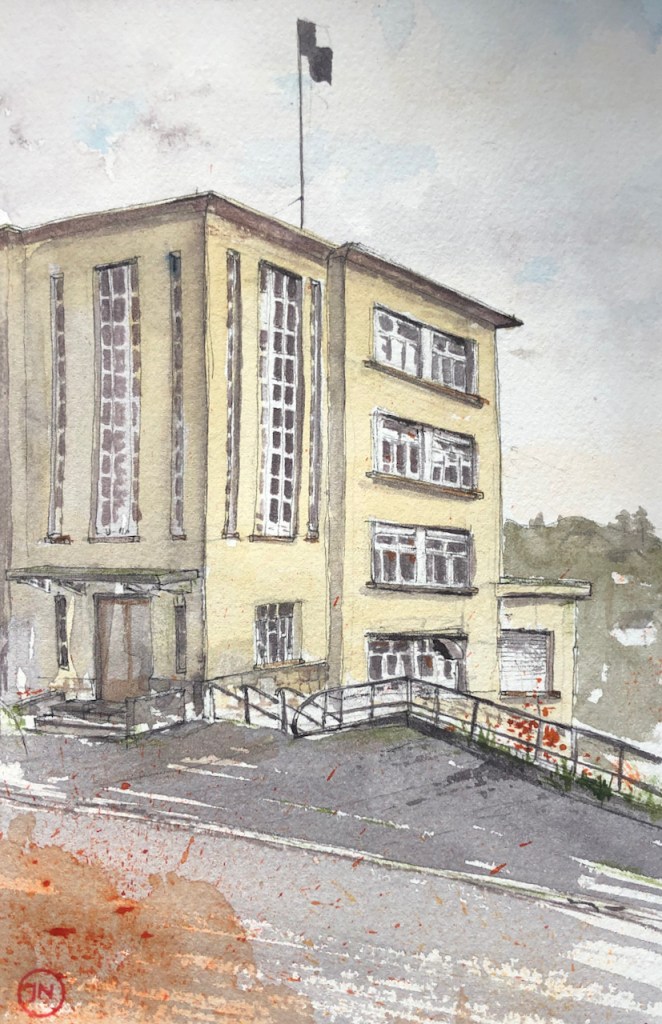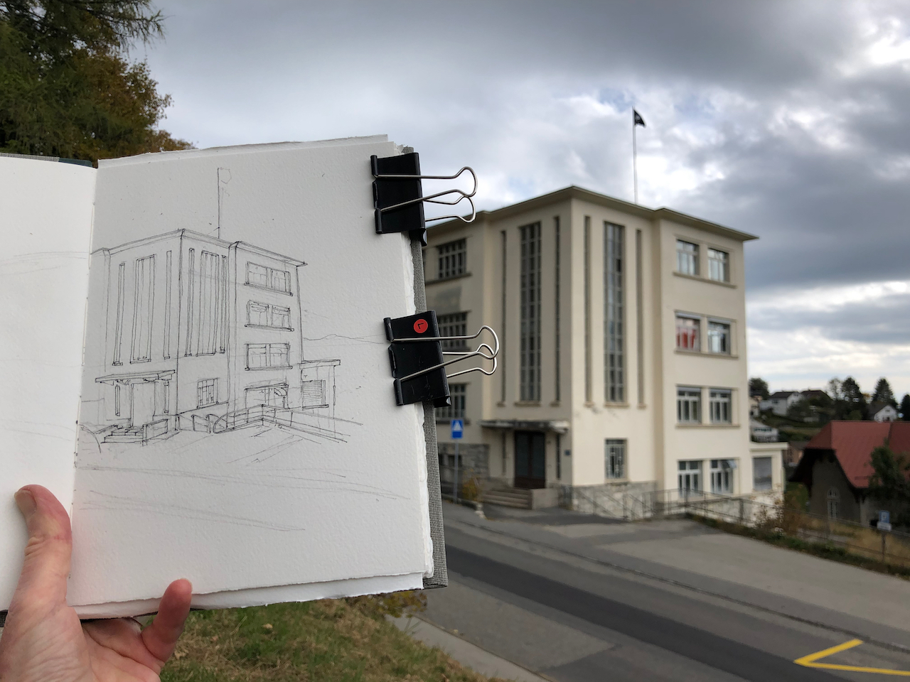 It was raining in Switzerland. Here is a sketch I did looking out of the window of the Hôtel de France, Sainte-Croix, Vaud. The building with the flags is…