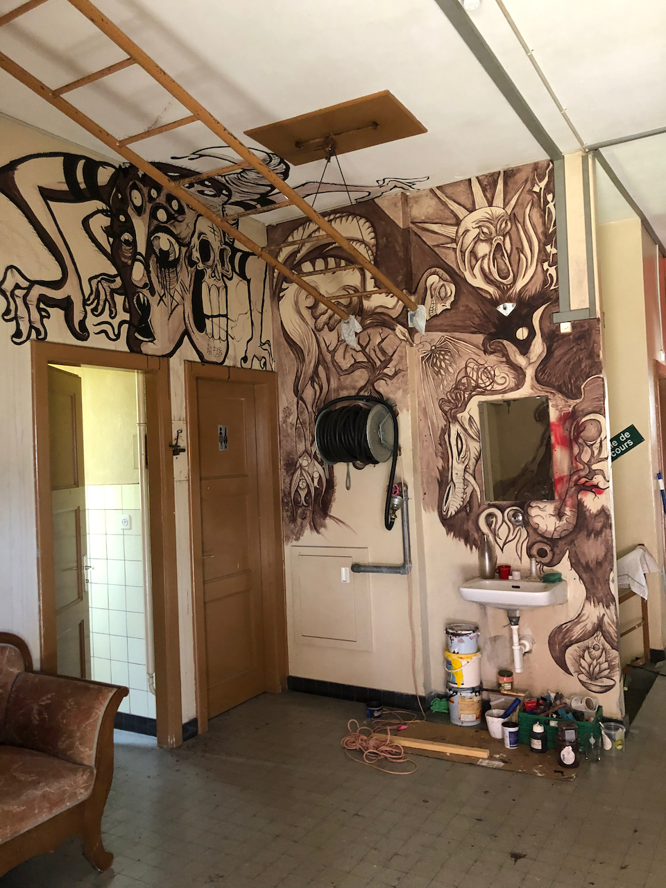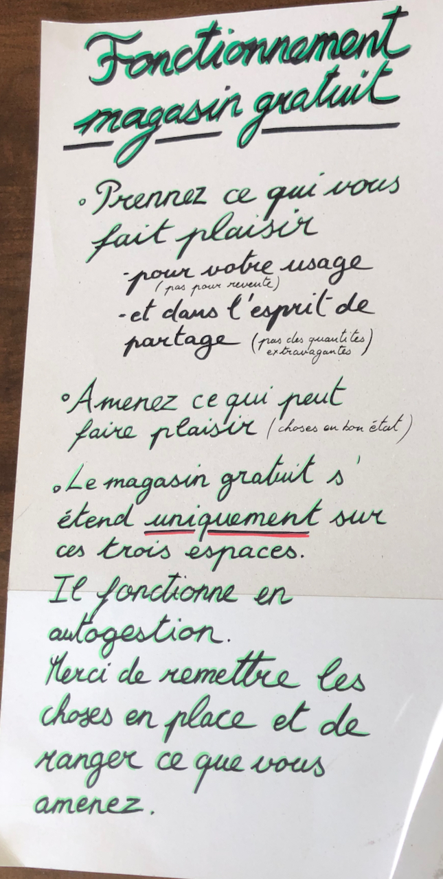 I walked around the empty spaces. It was all clean and organised. Someone had recently been working on the wall murals: there was a smell of paint. There are huge areas of blank wall and vast empty rooms. There is a “magasin gratuit” where you are invited to take what you need or bring goods to donate. A handwritten notice explains how it works.