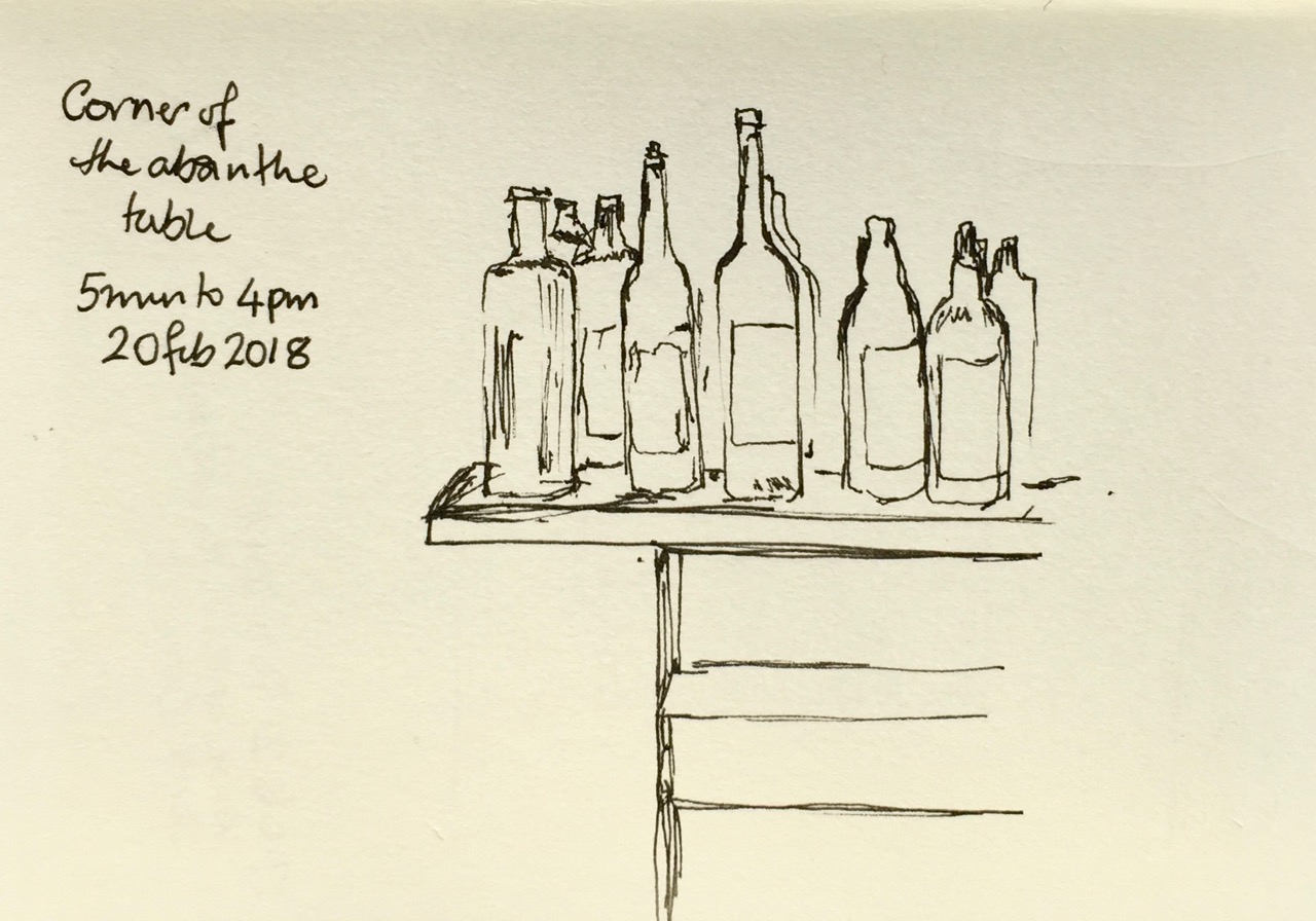 I sketched the absinthe table. The bottles look like a group of people waiting for something to happen. Like people, the bottles have common basic characteristics, but each has their individual variations.