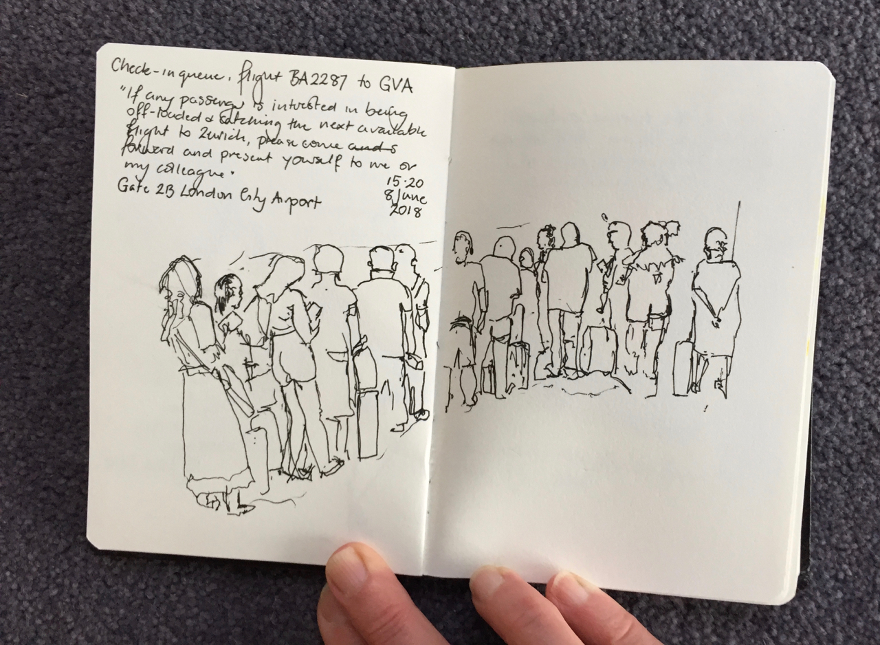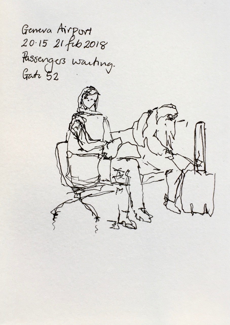 Pen and ink sketches are a good way to fill in the time waiting while travelling: