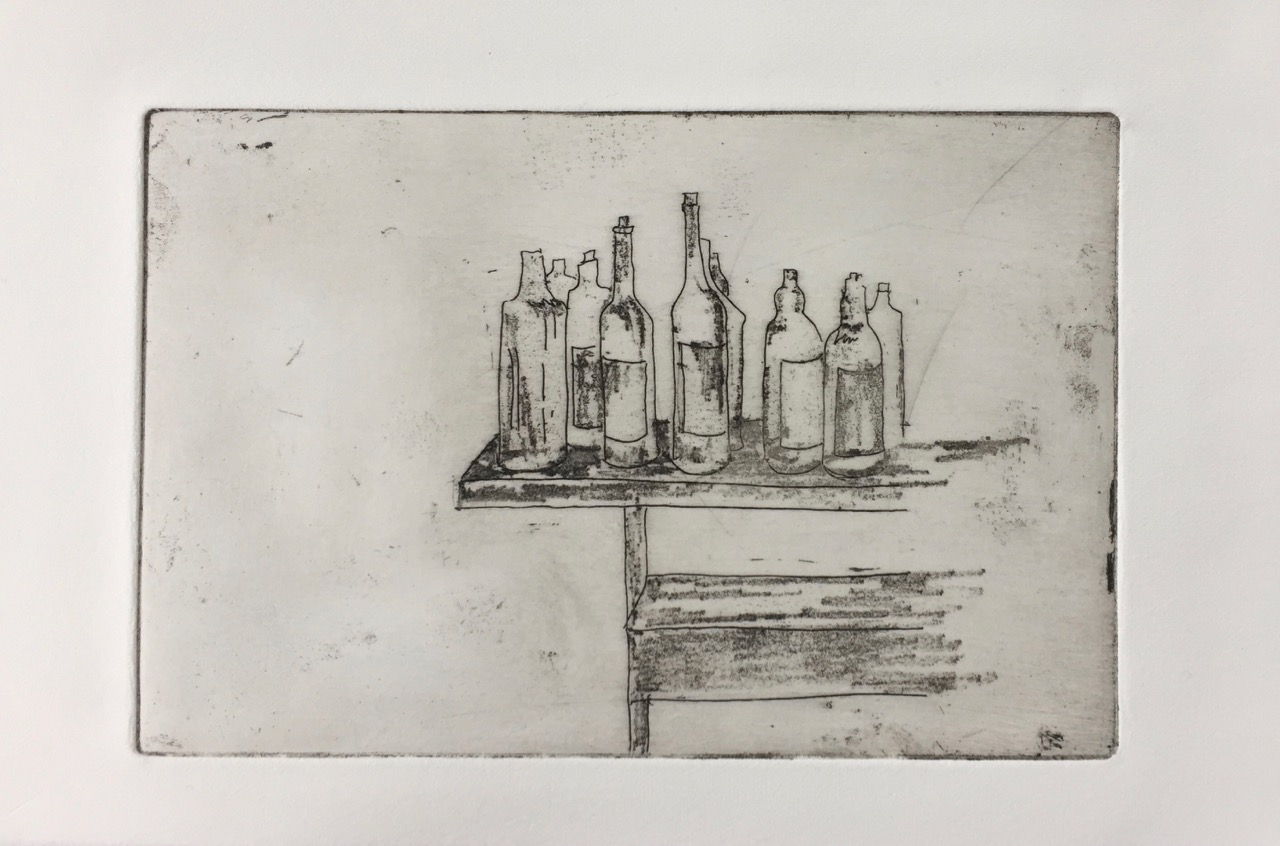 Here is an out-take, the very first print of this series. The bottles are in hard-ground only, and the registration is totally off. But perhaps that weird dislocation is appropriate for a picture of an absinthe table.