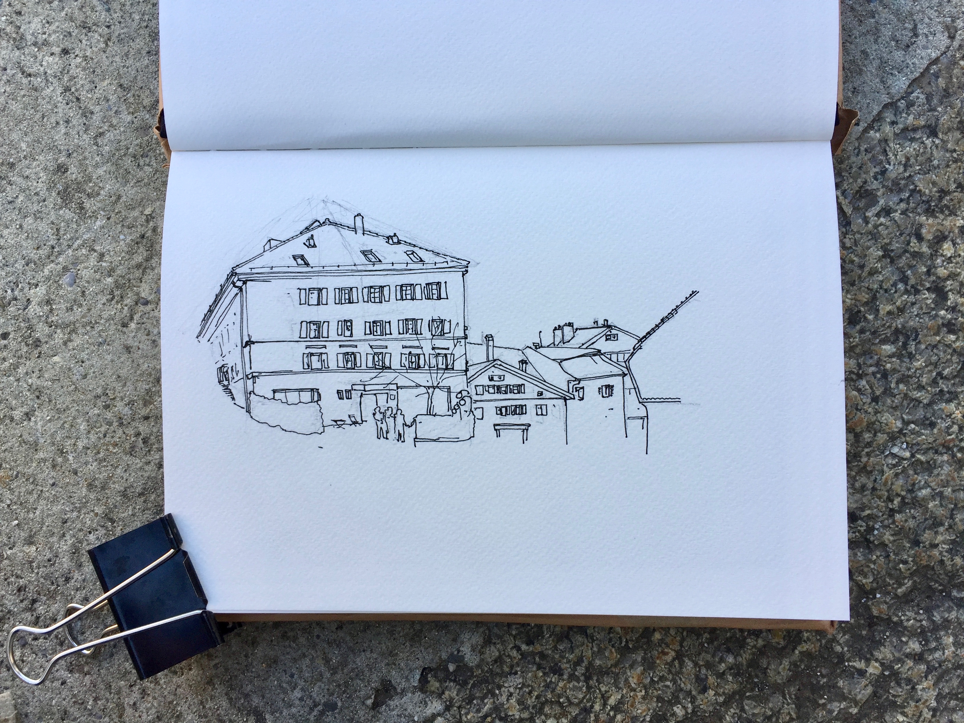It was raining in Switzerland. Here is a sketch I did looking out of the window of the Hôtel de France, Sainte-Croix, Vaud. The building with the flags is the Hotel de Ville or town hall.