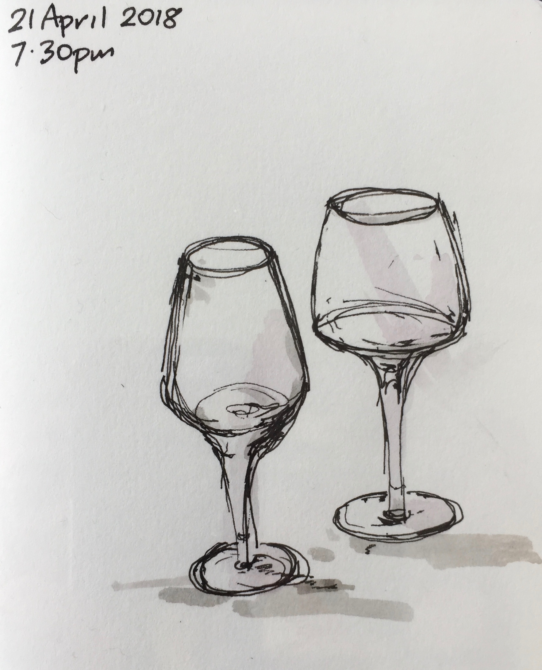 They are all done using only Robert Oster Signature Fountain Pen Ink, colour: Black Velvet. This ink has the property that is produces a chromatograph effect, blue and pink, as it runs and dilutes with water. See, for example, the left hand side of the “wineglass” drawing, where you see black, blue and pink.