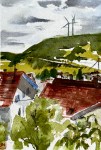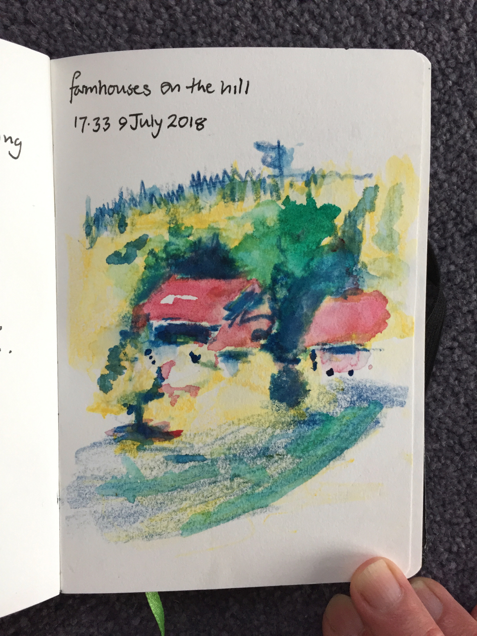 Here’s another experiment with the watercolour sticks. I was walking back from the swimming pool, and saw this sweep of land and the farmhouse sheltered by trees. I was shortly due back at the hotel, so I made this sketch in about 10 minutes, sitting on the road. The watercolour sticks throw the colour on very quickly, and don’t allow me to fuss.