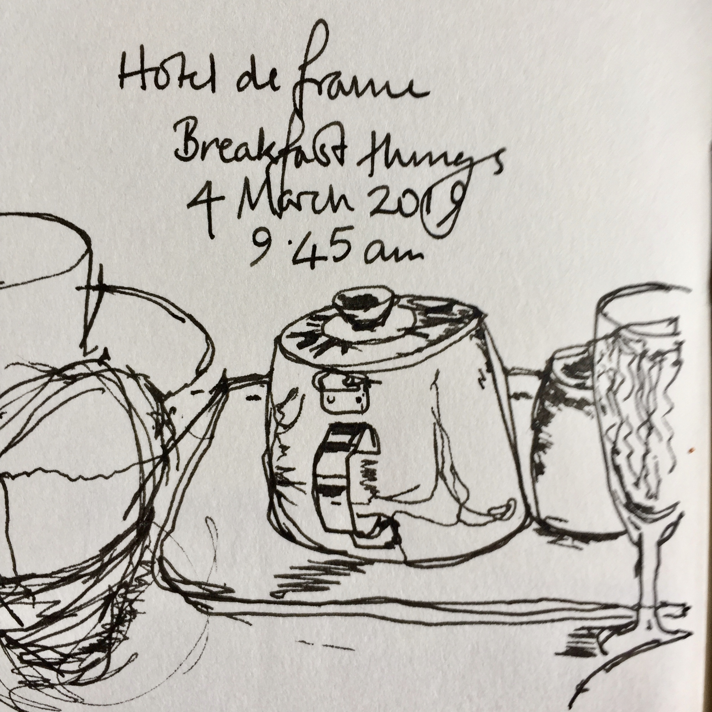 Work in progress on the drawing of the Hôtel de France, 19 April 2018. Jackson’s watercolour sketch book, 7″ x 10″