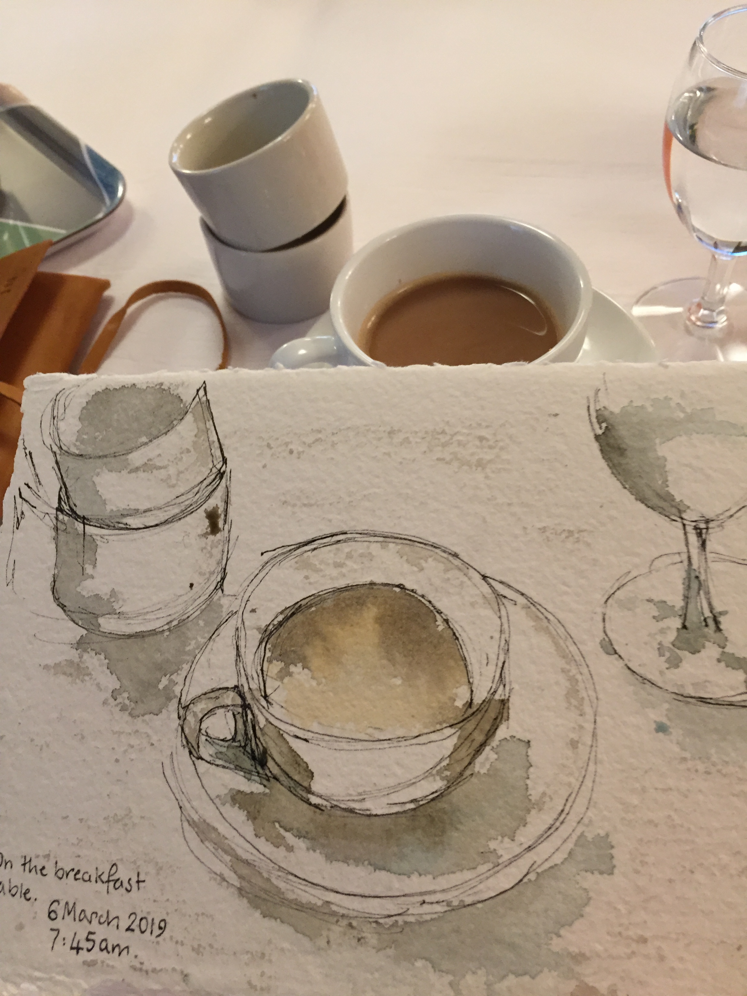 In between work on the computer and discussions, I made small quick sketches of what was in front of me. I experimented with watercolour sticks, which are very messy, but deliver strong bright colour.