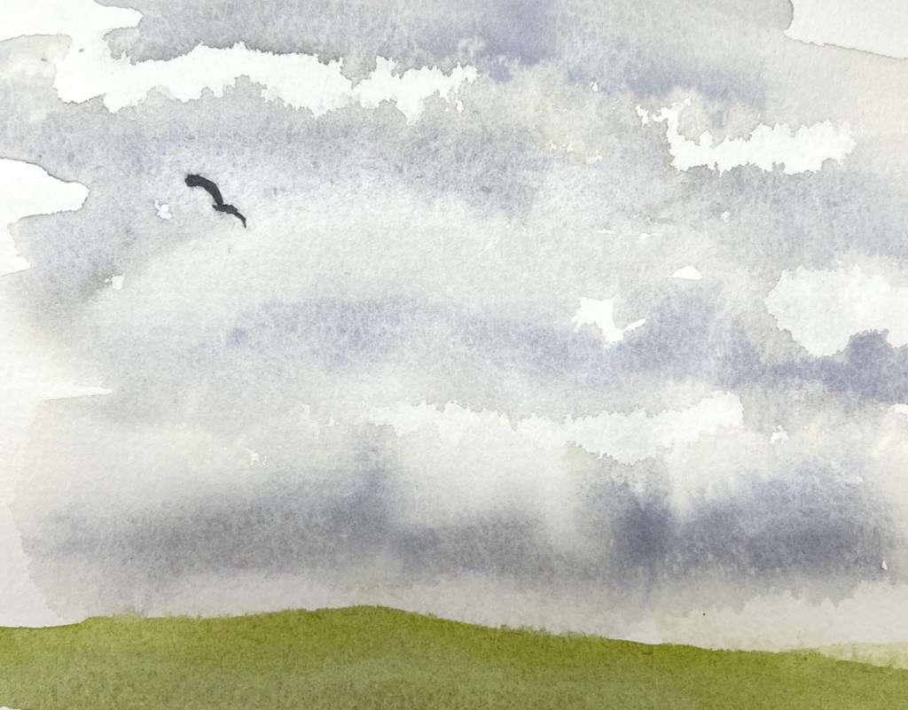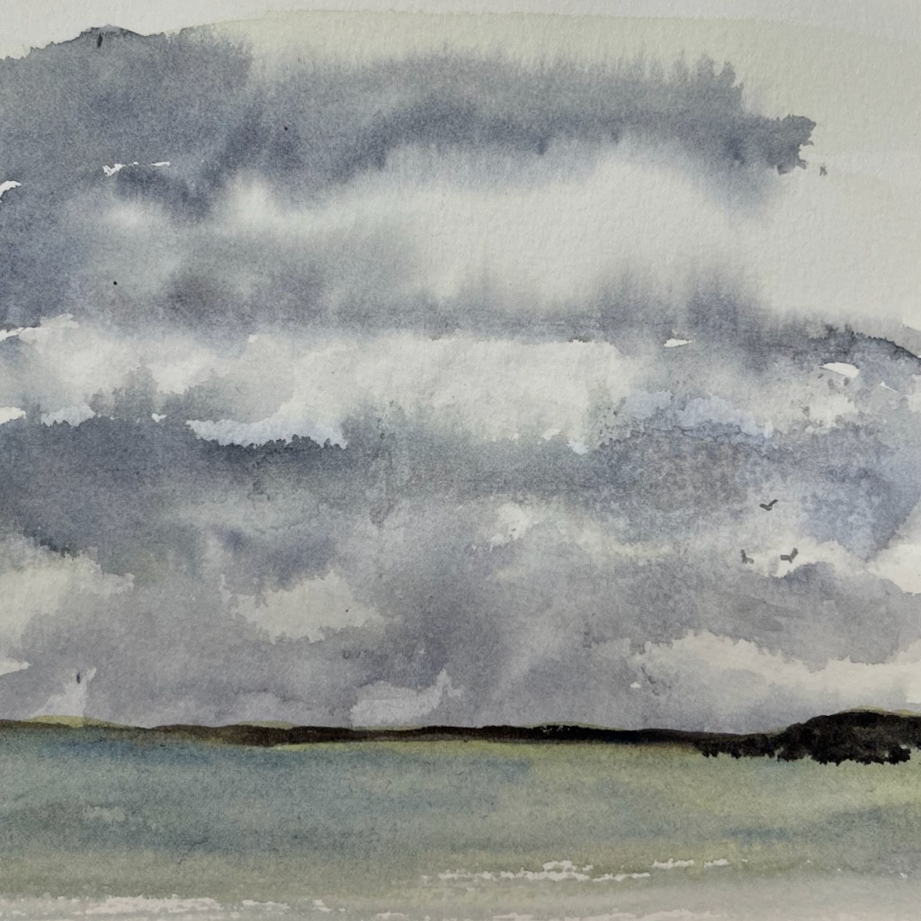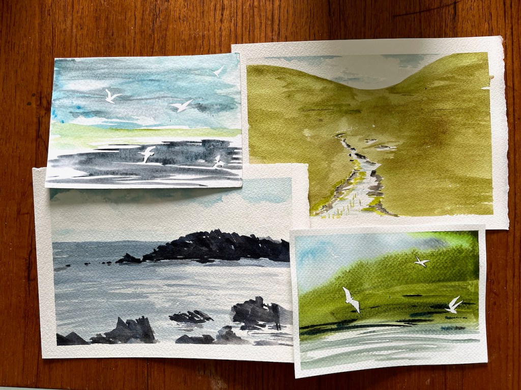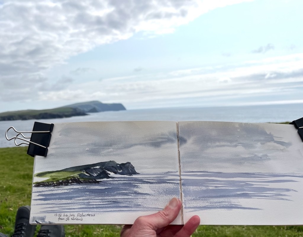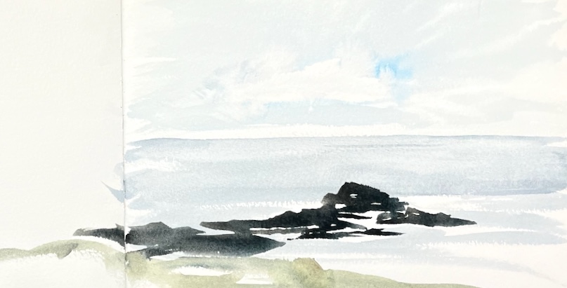 Even though the wind shifts the pages and disrupts my lines, even when the rain speckles my colours and blurs the clean edges I drew, even though the view changes by the minute and I find it impossible to catch the glory of the light and the magnificent shape of the land, even though my sketchbook is small and my skills are limited, despite all those things, I think it’s always worth having a go at drawing. The pictures I draw remind me of being there. Of the wind, the rain, the changing clouds, the glorious light and the vast, curving headland.