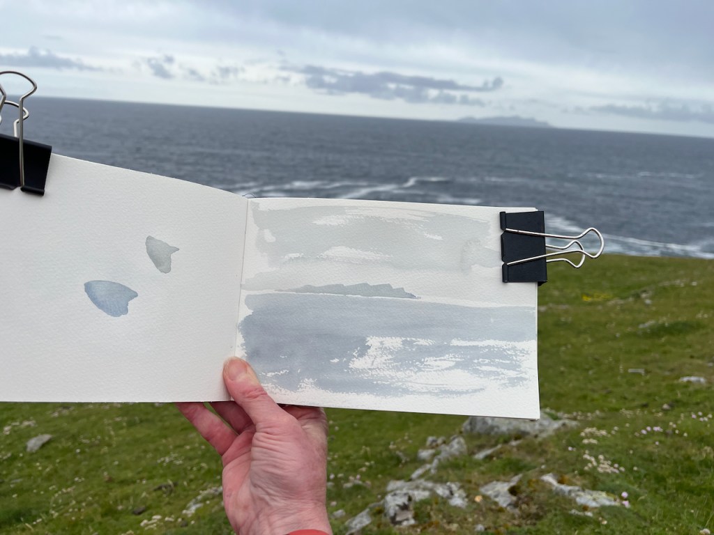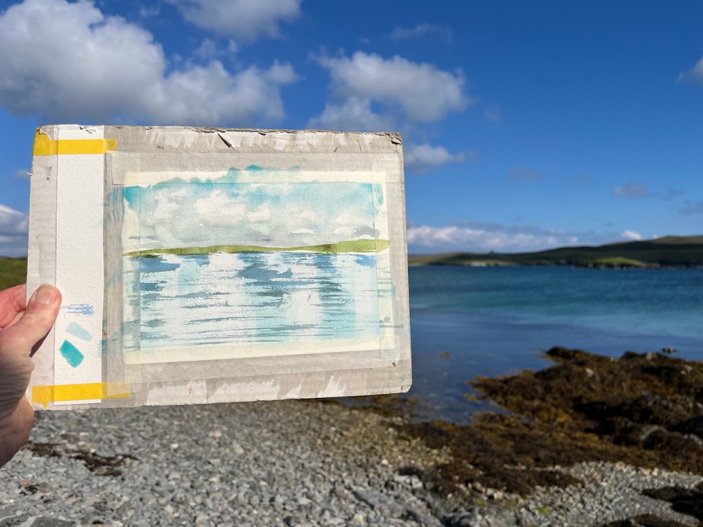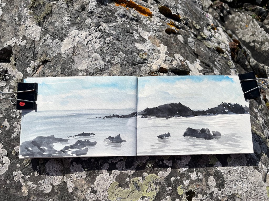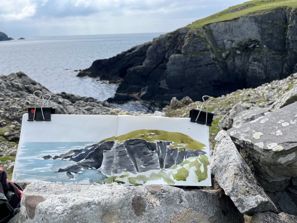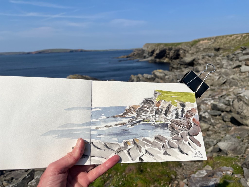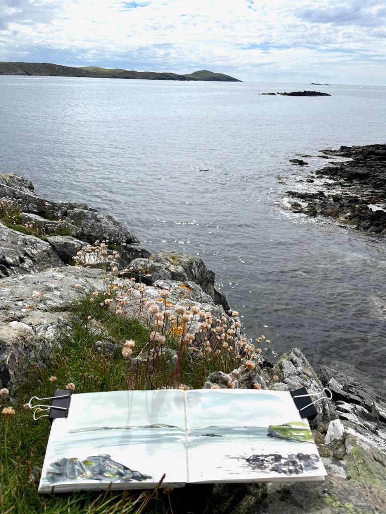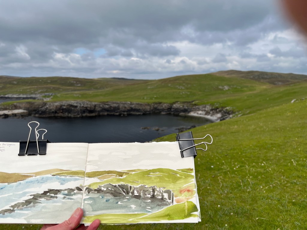 These pictures make it all look calm. It’s not calm. Shetland is a very windy place. While I am sketching, unseen forces turn the pages, move the paint palette around and tip my water over.