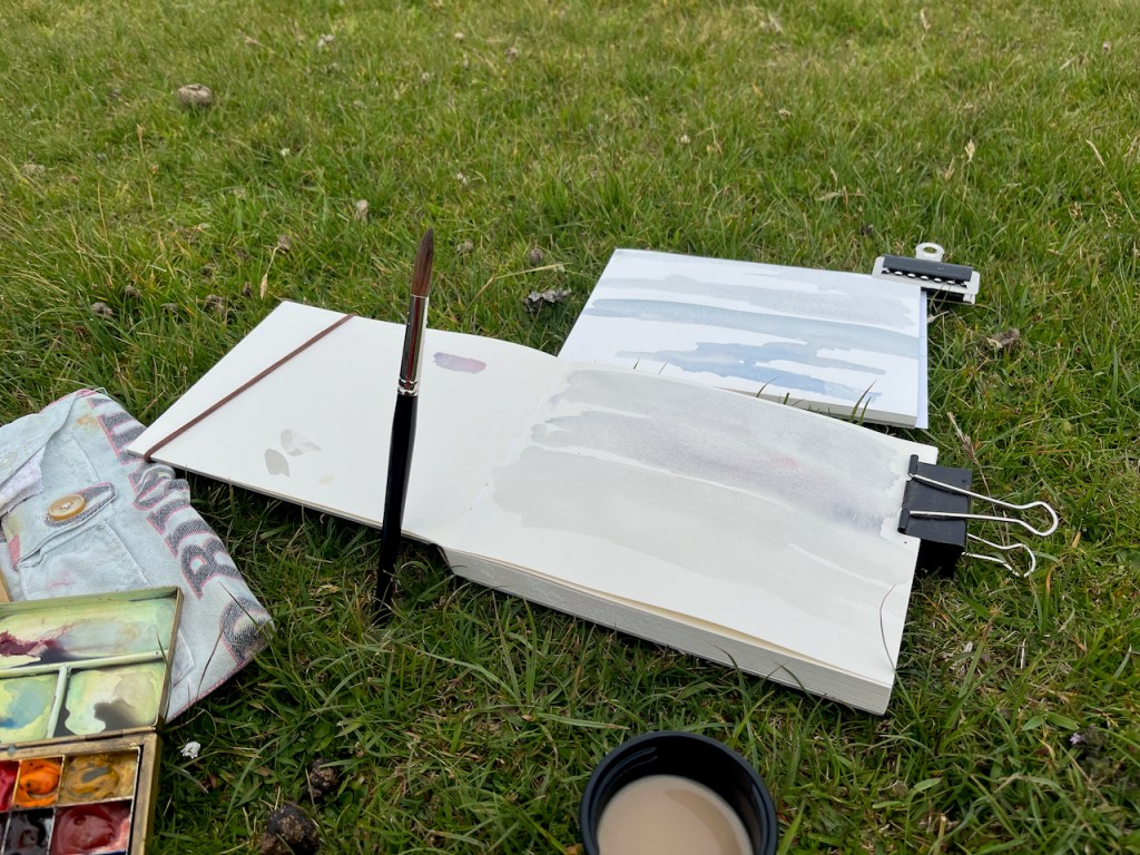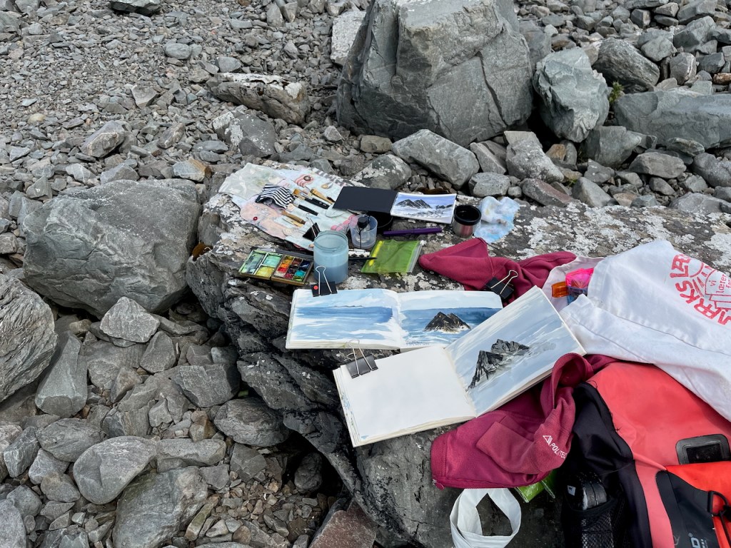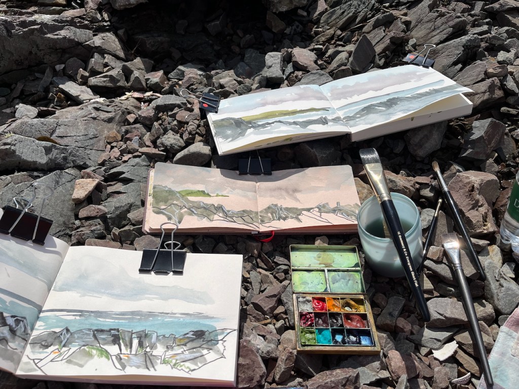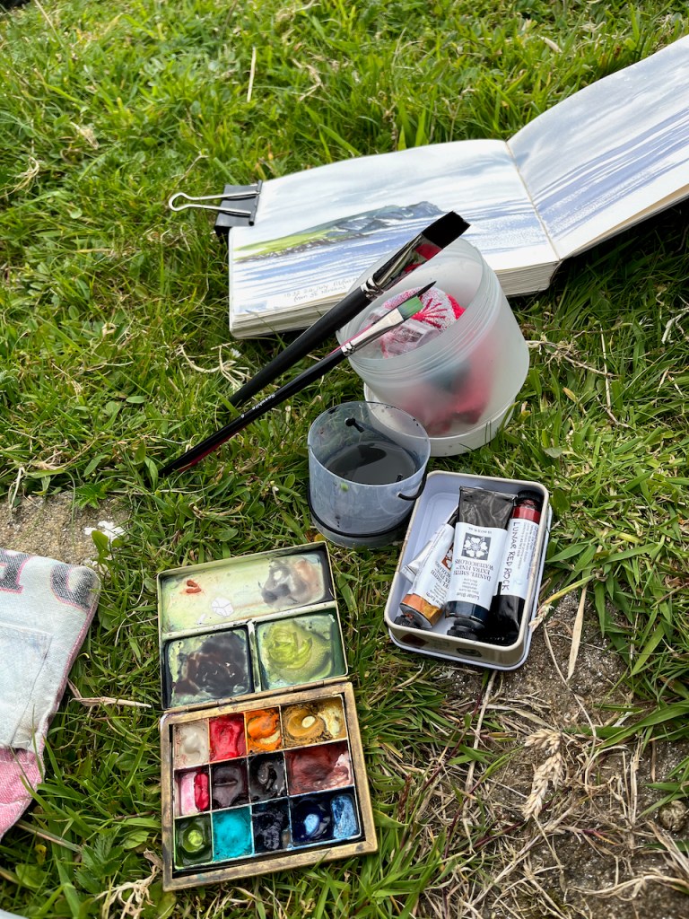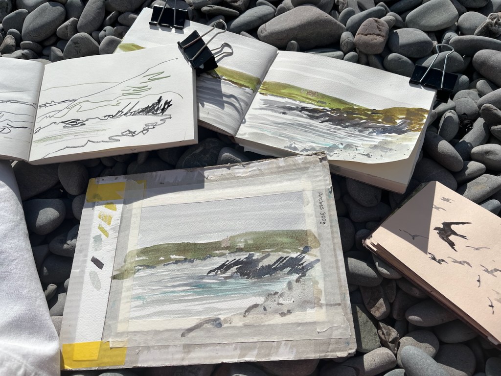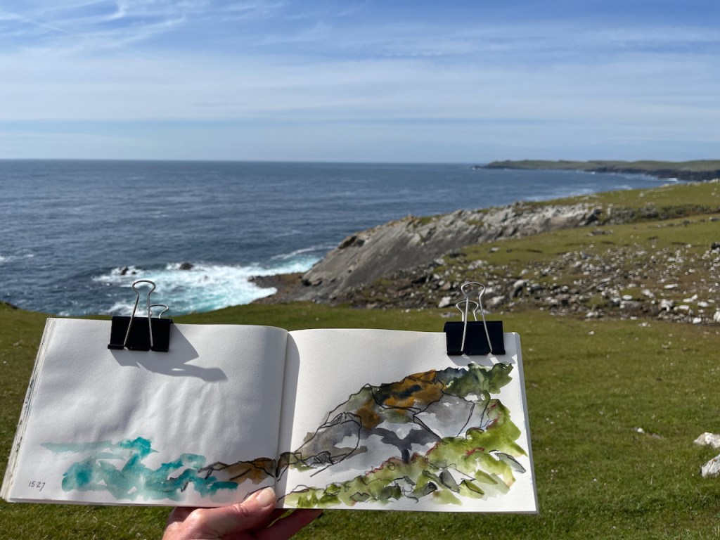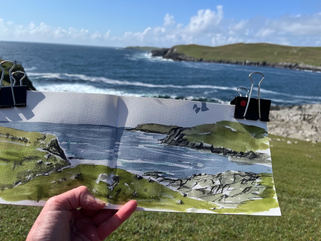 These pictures make it all look calm. It’s not calm. Shetland is a very windy place. While I am sketching, unseen forces turn the pages, move the paint palette around and tip my water over.