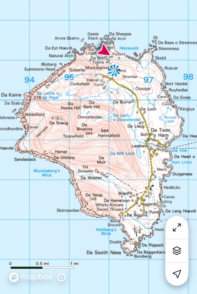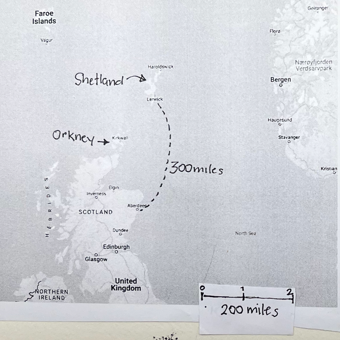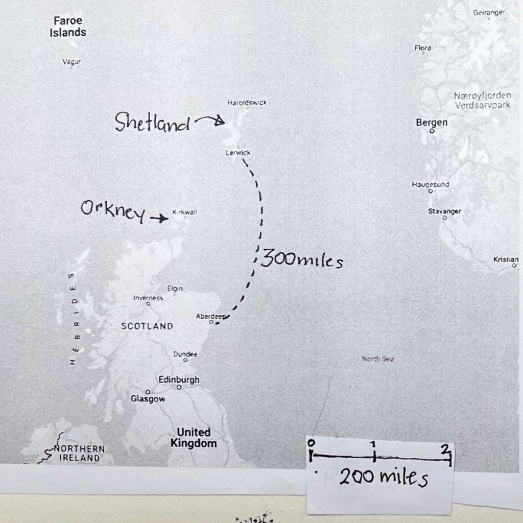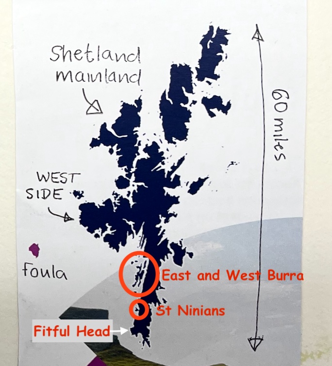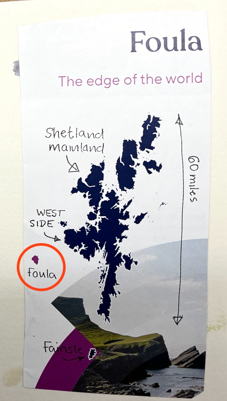 300 miles from Aberdeen to ShetlandFoula is 20 miles off the West coast of ShetlandFoula: an island 3 miles by 2 miles. Arrow shows where I stayed.