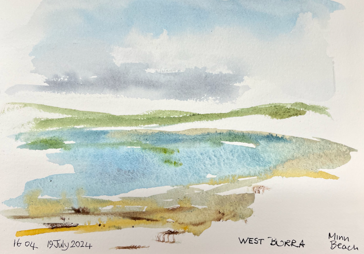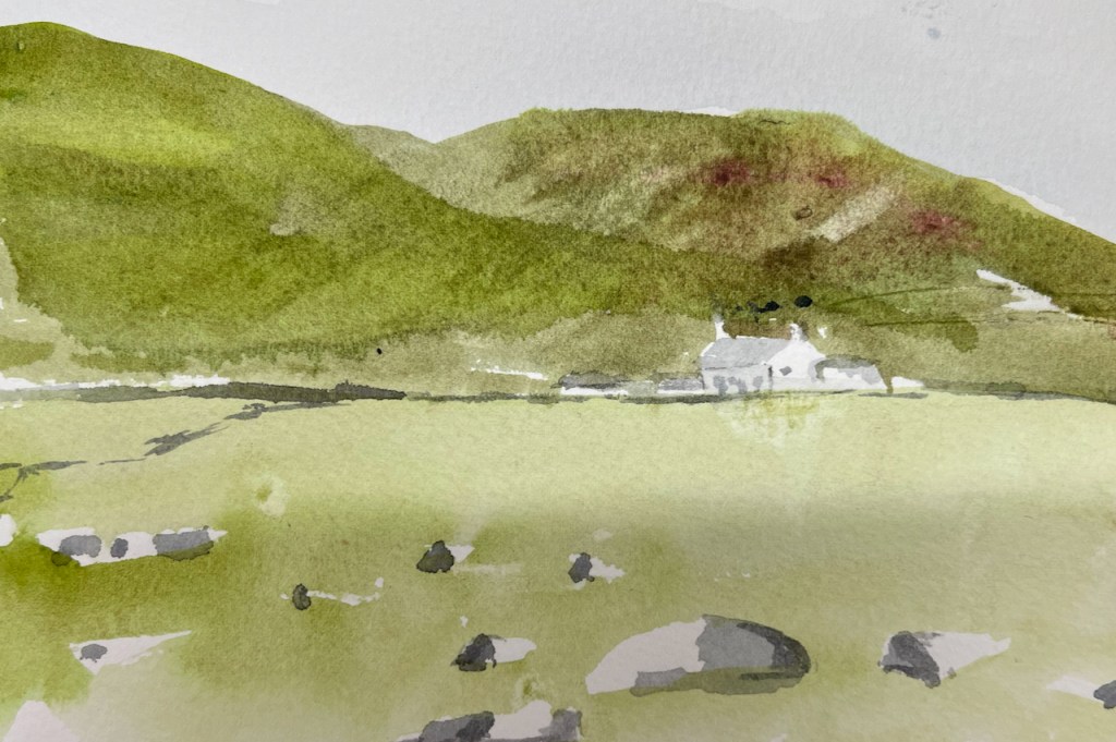 I sketched this sitting on one of the stones, on a bit of flat and marshy land towards the south of the island. The road is in front of me, at the foot of those hills.
