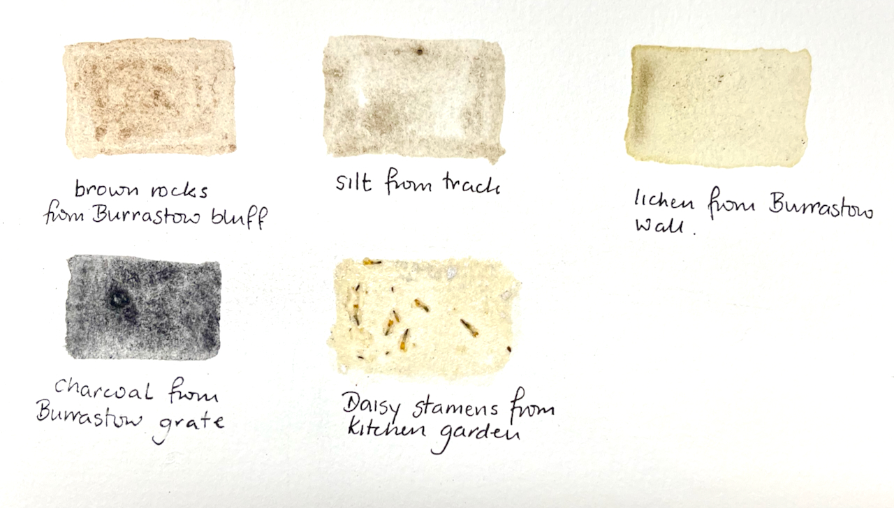 Above you see paints made of earth from different places. At the front is a paint made from yellow lichen. The lichen was bright yellow on the stone wall. I couldn’t find a way to separate out the bright yellow surface from the grey underneath, so the pigment is a grey/yellow mix.