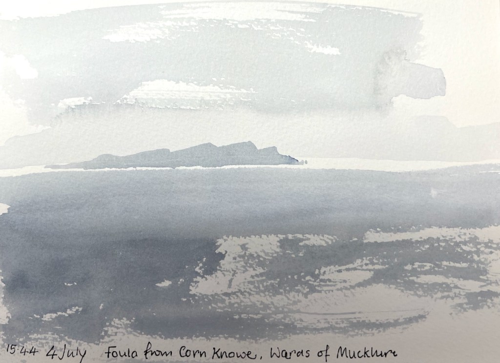 I had to sketch this in a bit of a rush, because, as I rapidly discovered, this particular area is the province of the Skua. There are Great Skua and Artic Skua: large birds, who do not like sketchers sitting on stones in their neighbourhood. They make their irritation known by aggressive fly-pasts. I could hear the wind in their feathers: it sounded like a chain saw. So I quickly took the hint and made for the road. Locals later told me I should “carry a stick above my head”, to distract the skua. That’s all very well, but finding a stick on Foula is about as likely as finding a branch of Pret. There are no trees atall on this part of the island, so no handy lengths of wood.