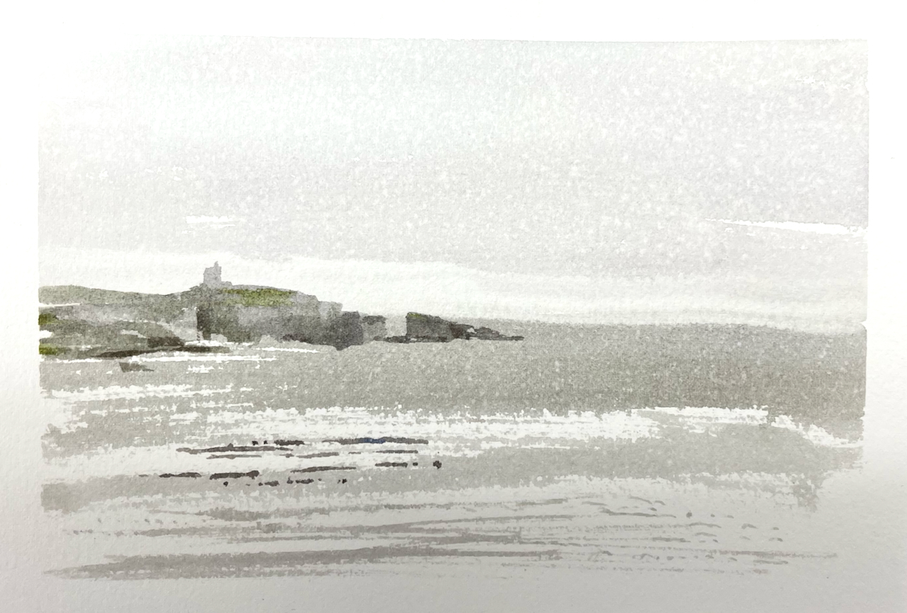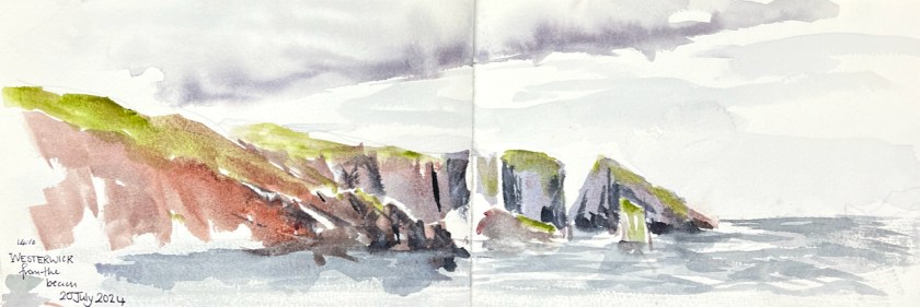 Here is Burrastow House and Burrastow Cottage, an evening view. I sketched this on top of a sky view I’d sketched earlier, but which had been spotted by rain, as you see.