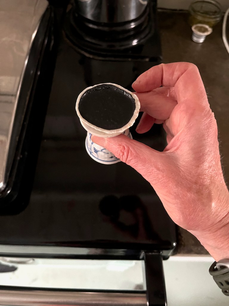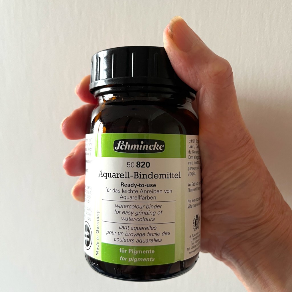 Now I have earth pigment. To make watercolour I add Schmincke Watercolour Binder in the ration of 2 parts binder to 1 part pigment. Mix and put in a limpet shell. It’s ready to use immediately as a paste, or it dries and can be rewetted like normal pan watercolours. Here are the paints drying: