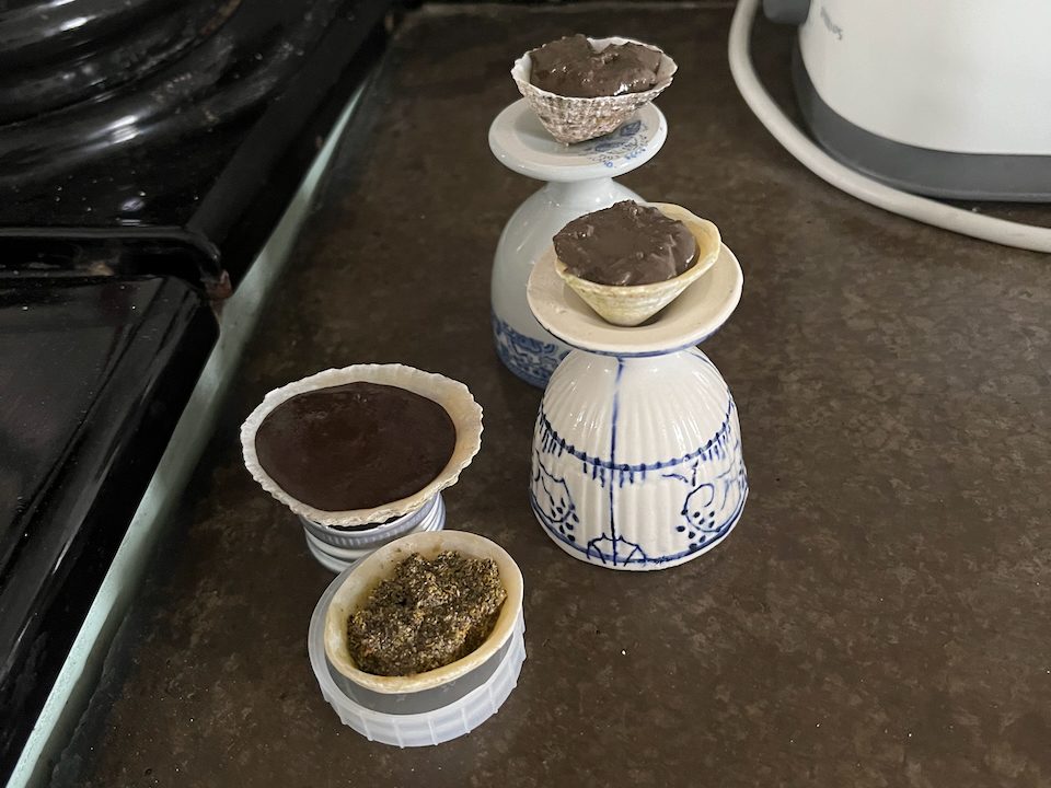Pigment mixes in limpet shells, drying on eggs cups (to keep them level).