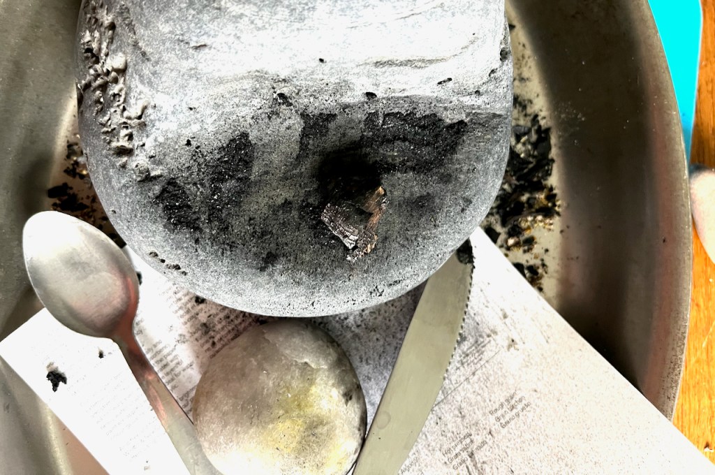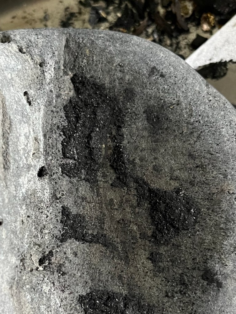 Making the charcoal pigment was not so effective as I thought it would be. I found a small chunk of black charcoal from the grate and proceeded to crush it. This produced skittering fragments and airborne dust which settled everywhere. It did not produce a fine powder in my pestle and mortar. It produced hard, flaky, bits. As you see above, the paint it produced was granular and not very black.