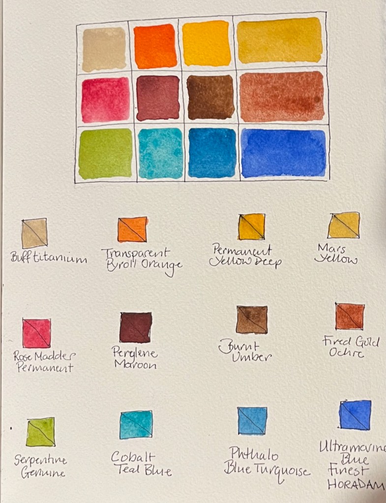 Here are the twelve colours in the paintbox. They are all Daniel Smith except the Ultramarine Blue, which is Schmincke Horadam.
