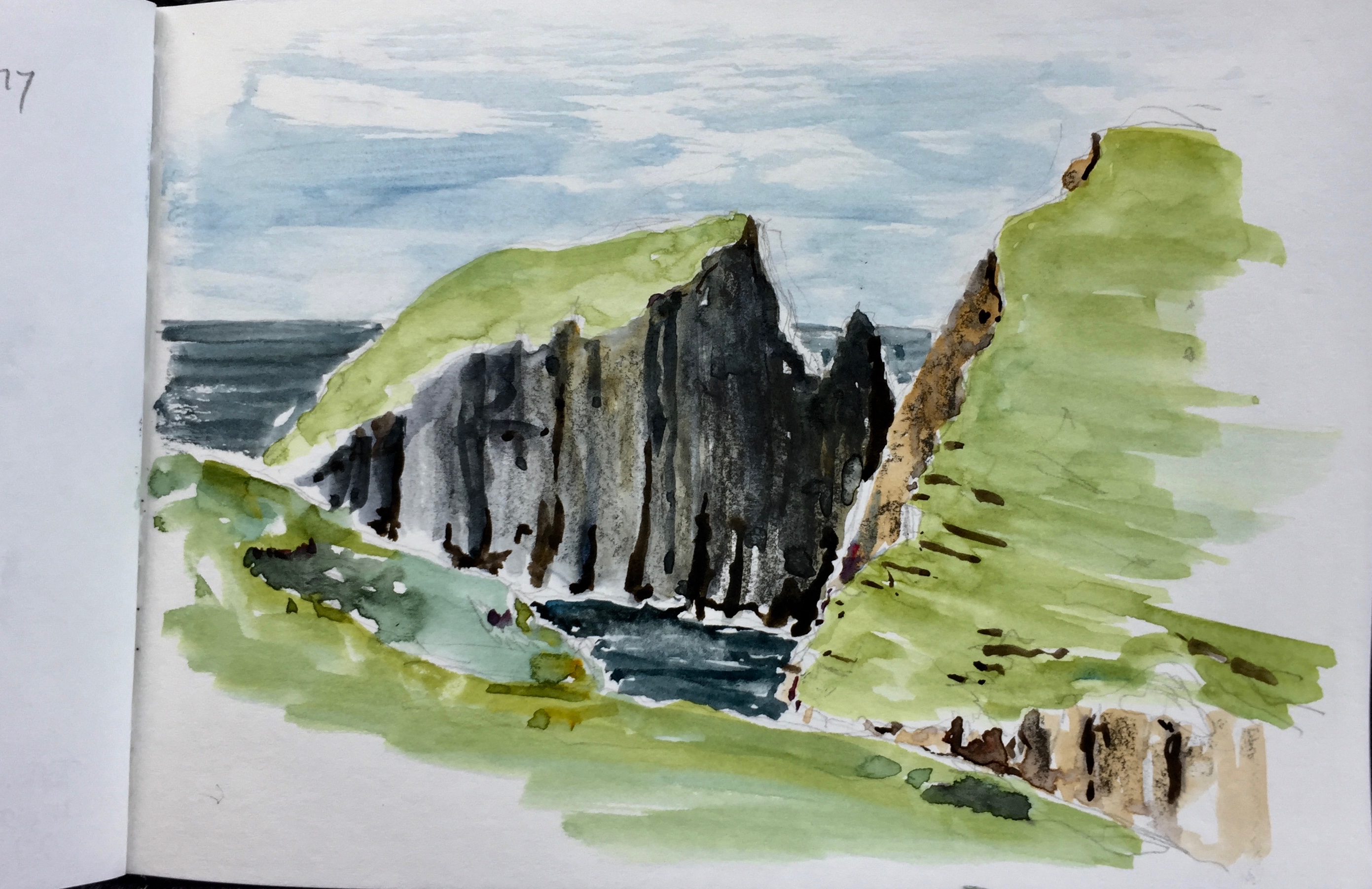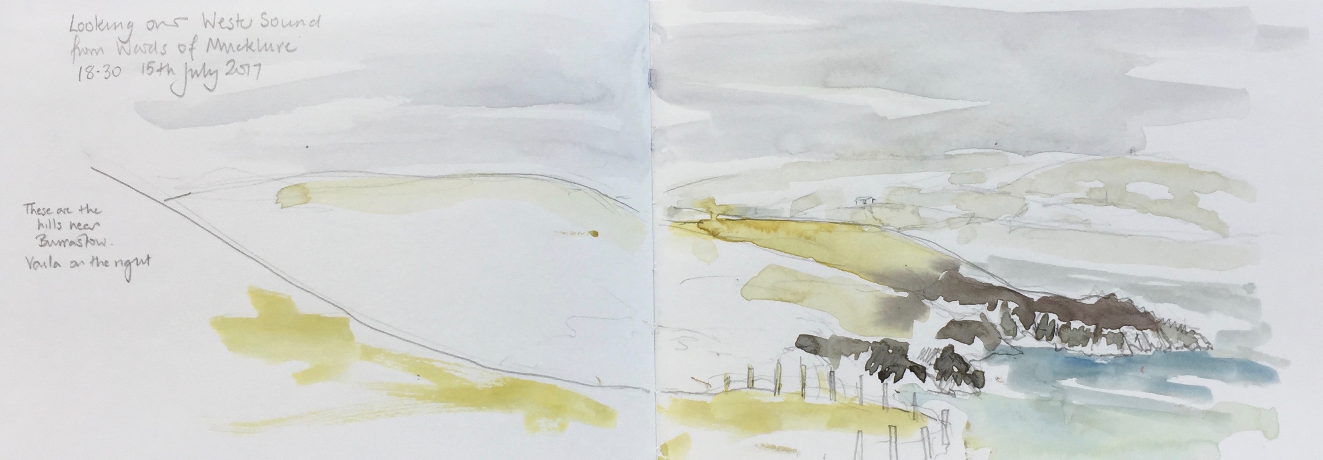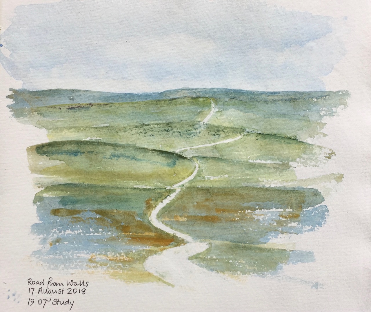 The other sketchbook I used was a Khadi cotton paper, much more absorbent. Below is a picture of the roads of West Mainland. The roads are calligraphic strokes on the landscapes.