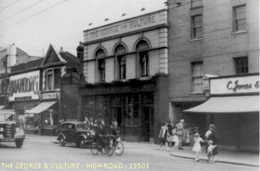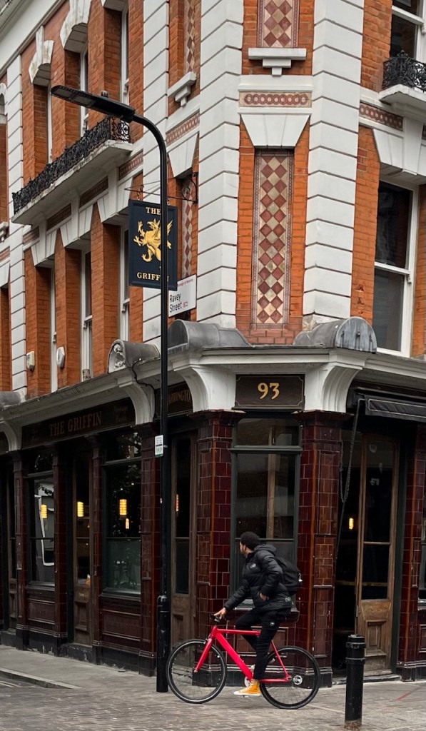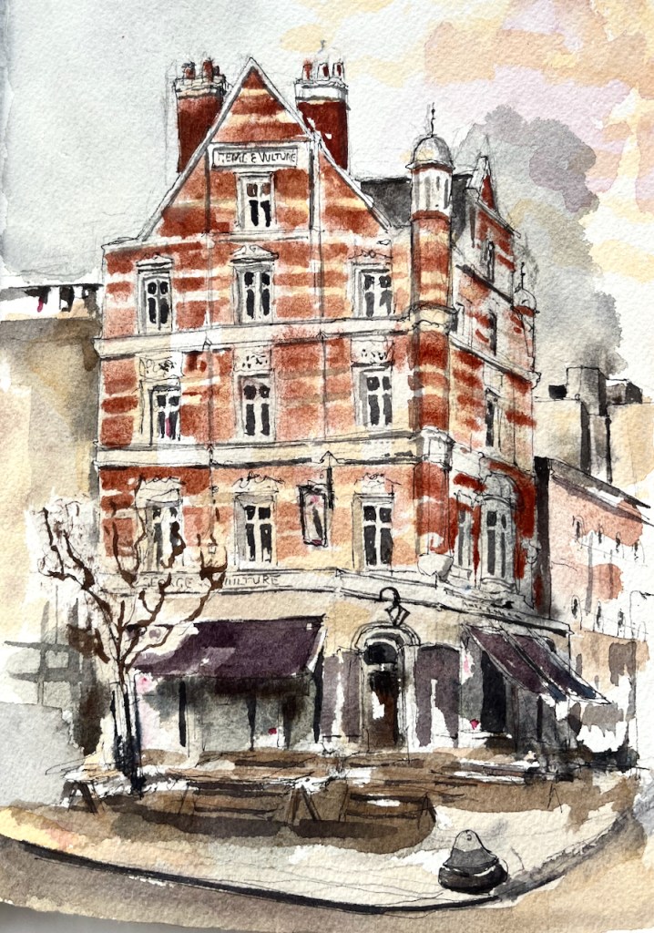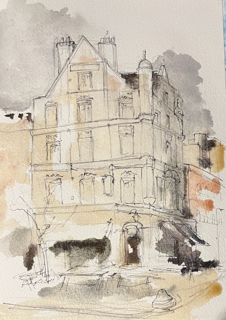 At that time there were tall chimneys on the front corners of the building, now reduced to stumps, as you see in my picture. Otherwise the building looks unchanged, on the outside at least. Even the cast-iron railings, centre left, are still there. The adjacent buildings on the right, with the ecclesiastical pointed windows, have been replaced by modern buildings, taller and boxier, with rectangular windows.